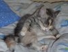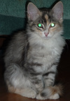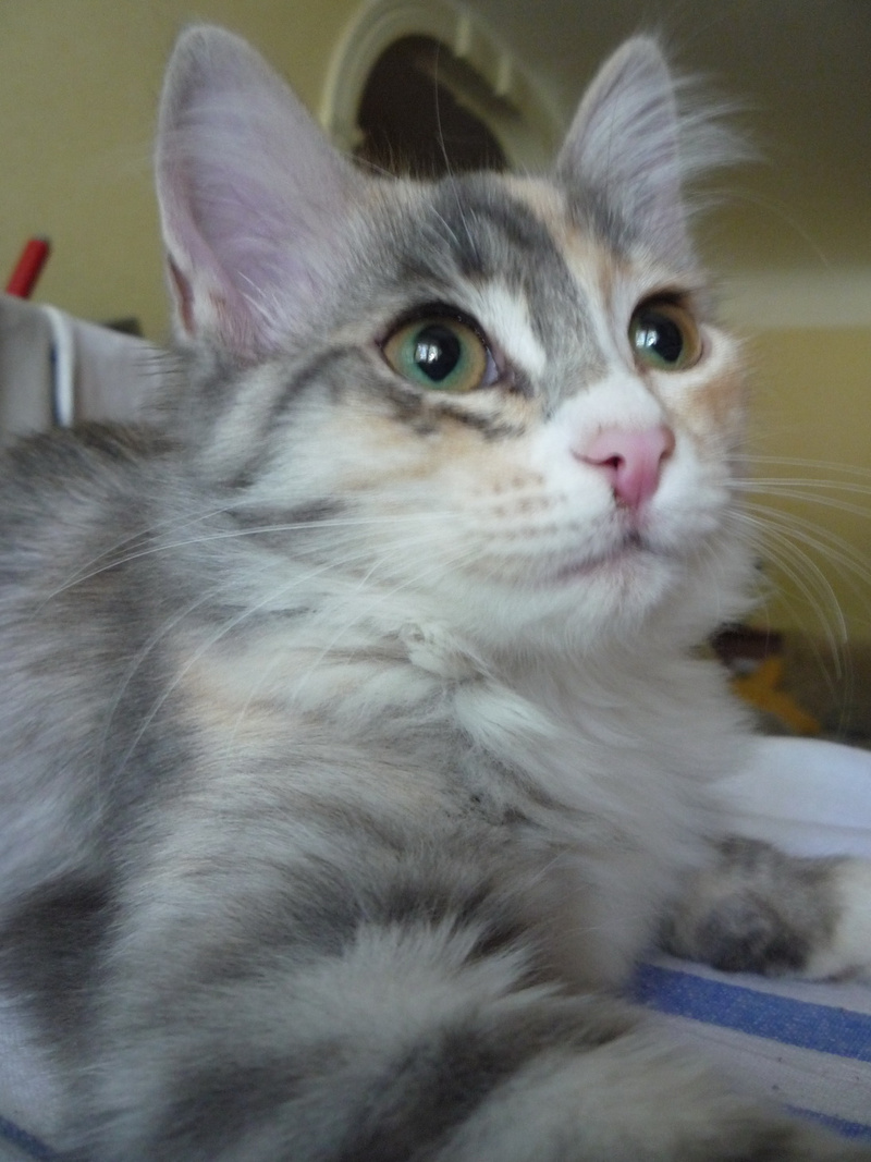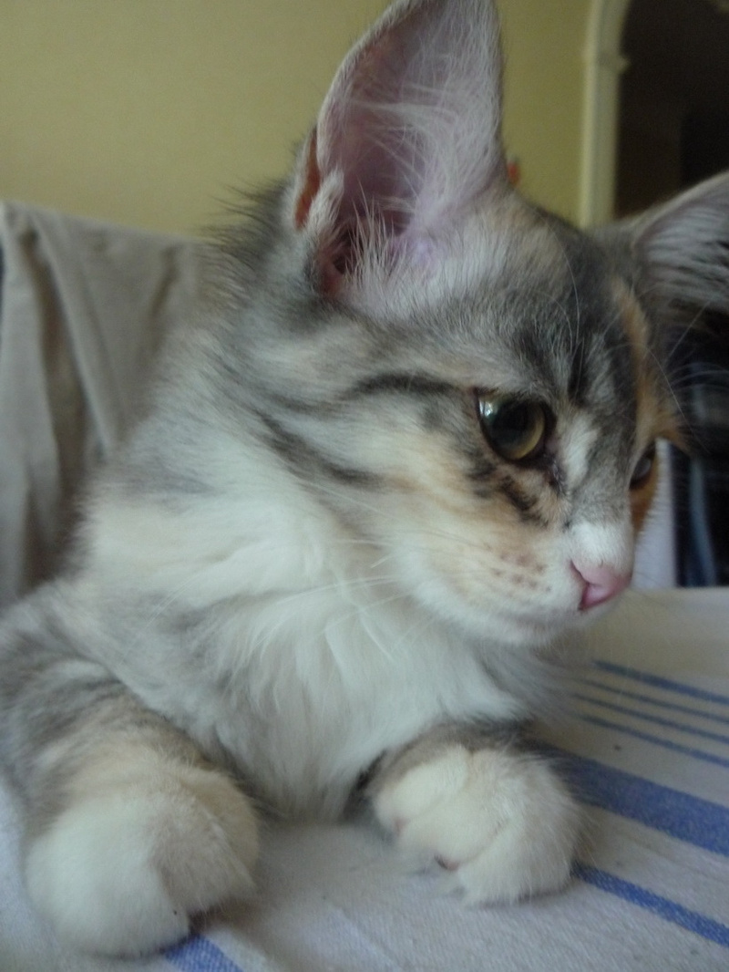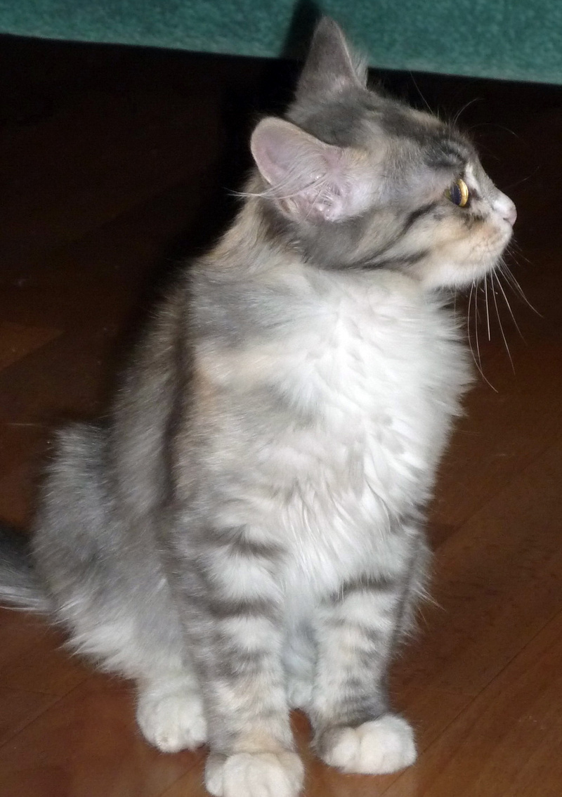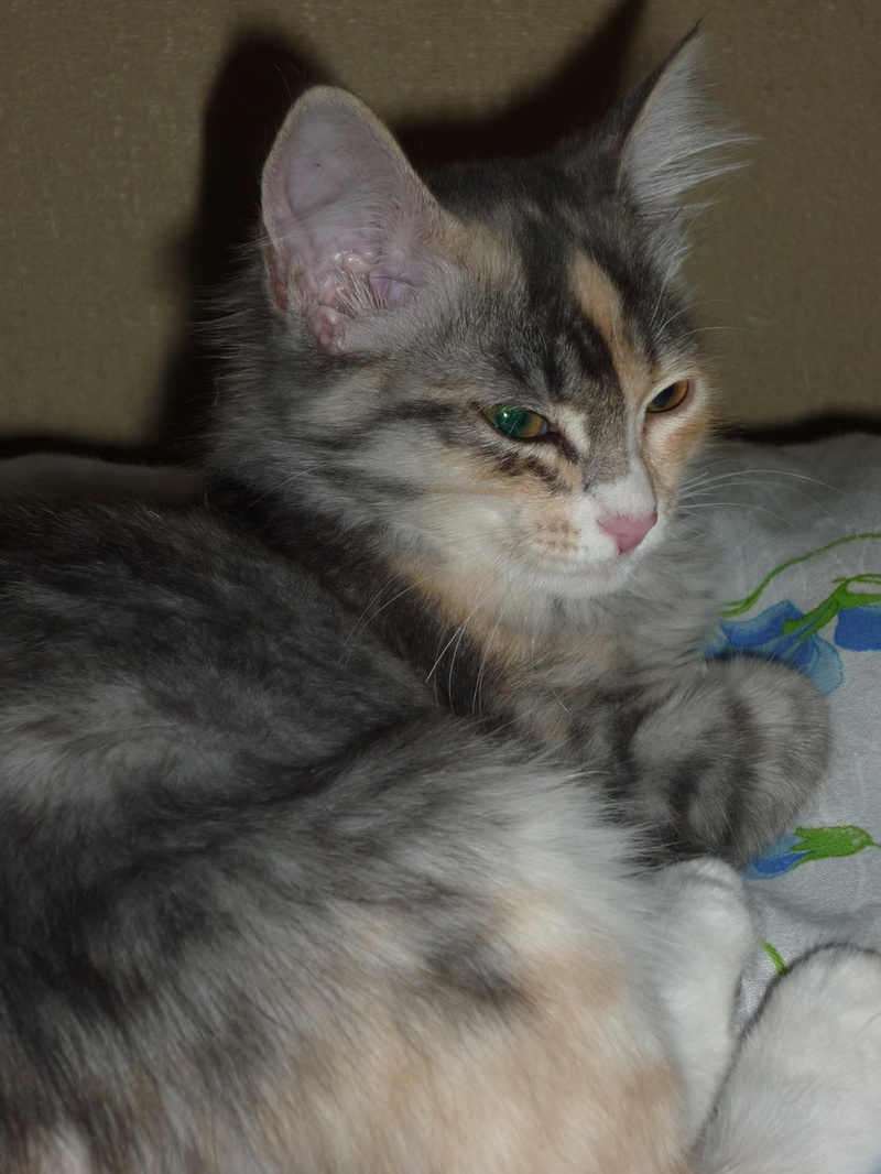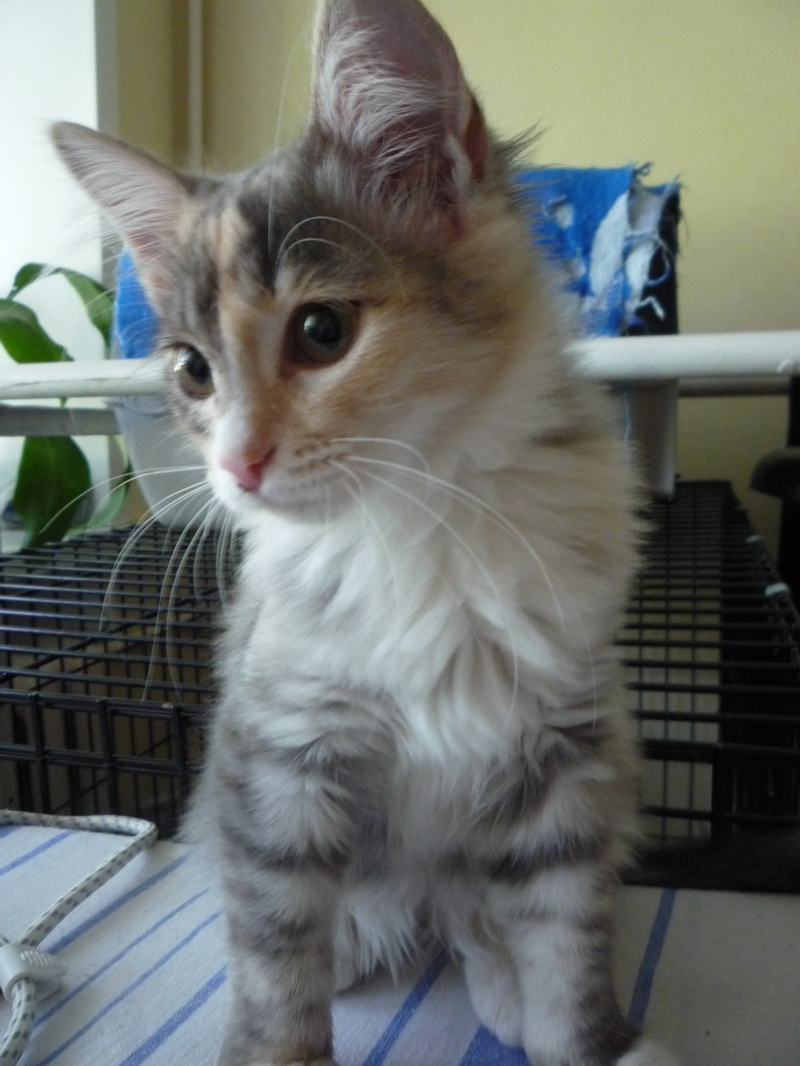 Ей примерно 3 - 3.5 месяца, она уже вполне самостоятельная, ходит только в лоточек, кушает без проблем сухой корм и, вообще, большая умница.