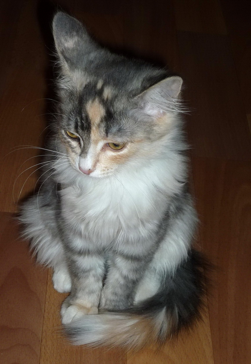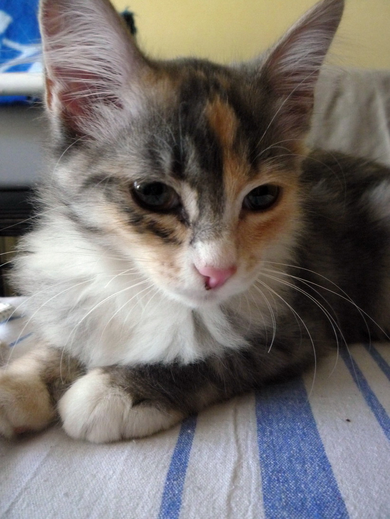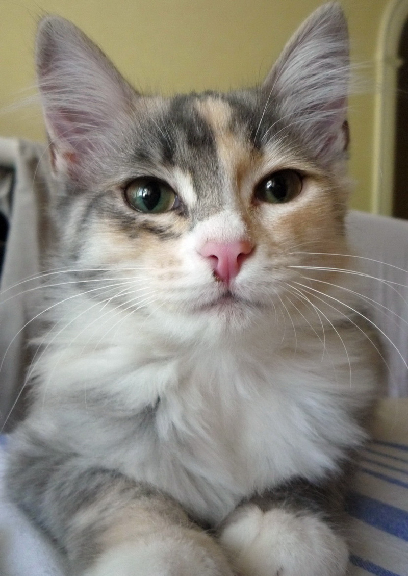 В своем юном возрасте эта кошечка уже натерпелась бед. Родилась в подвале, где и была найдена. Долго и успешно скрывалась от своих спасителей в темных закоулках, боясь, что ей сделают плохо. Но, когда все же оказалась в добрых и заботливых руках, почти сразу успокоилась.