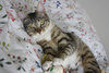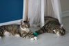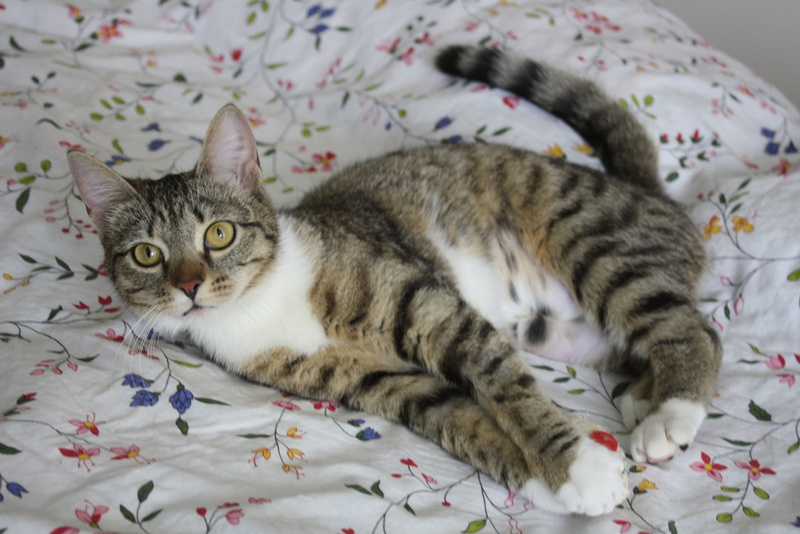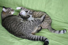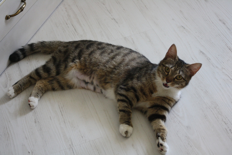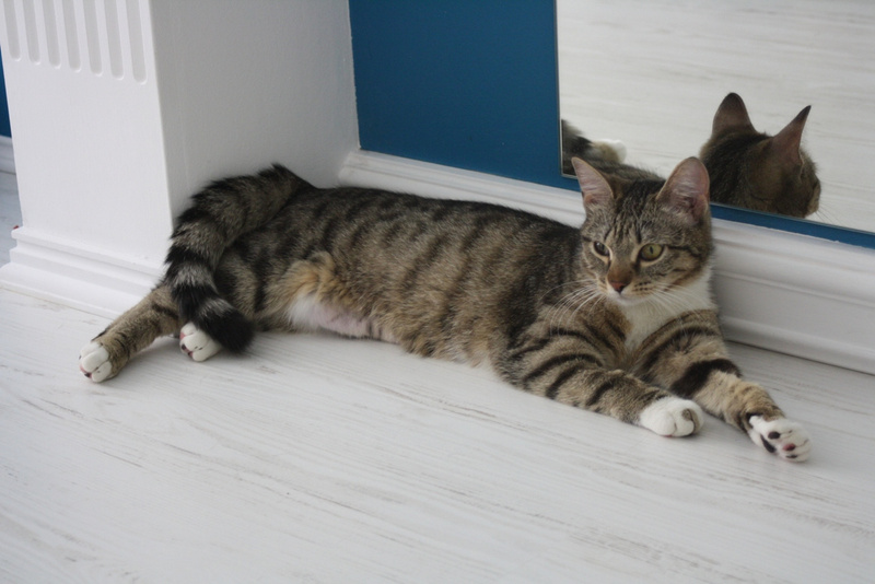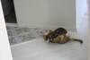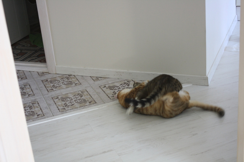 Прошло 1,5 мес. И кошку не узнать! Это неутомимое и вездесущее создание! Обожающее играть со всем, что попадется: стулья, коты, одеяла подушки, головы на подушках, коты, ноги под одеялом, фрукты на столе, коврики, коты, тени для глаз, мышки, мячики, кисточки, вода! Такой энергии и радости в кошках я не видела! Она наслаждается движением.