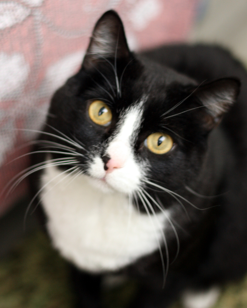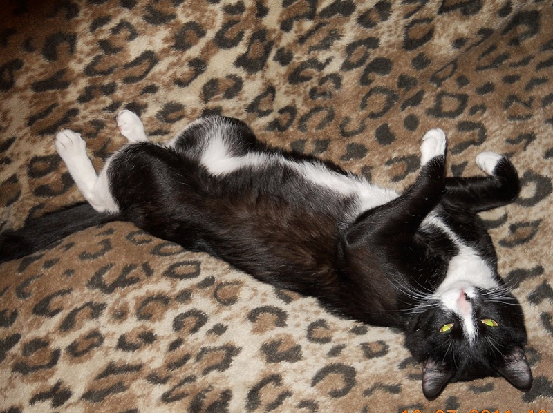 У нашего Кота замечательная блестящая шелковистая черная шерстка, белые манишка и носочки на передних лапках и настоящие гольфики на задних, а также роскошные белые усищи