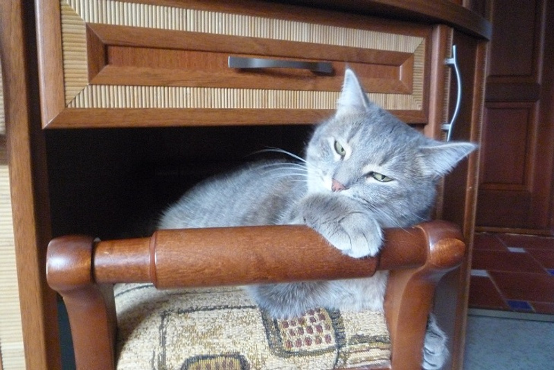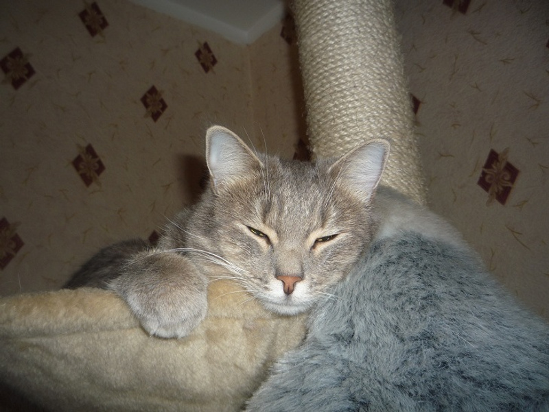 Очень коммуникабельная, спокойно реагирует на кошачьих, без истерик распушает хвост на собак. Активно пользуется котодромом и лотками в ассортименте.