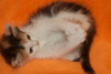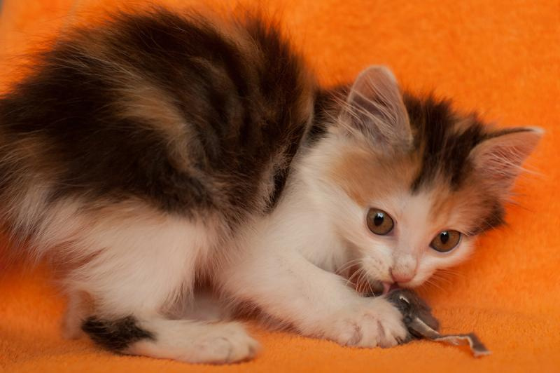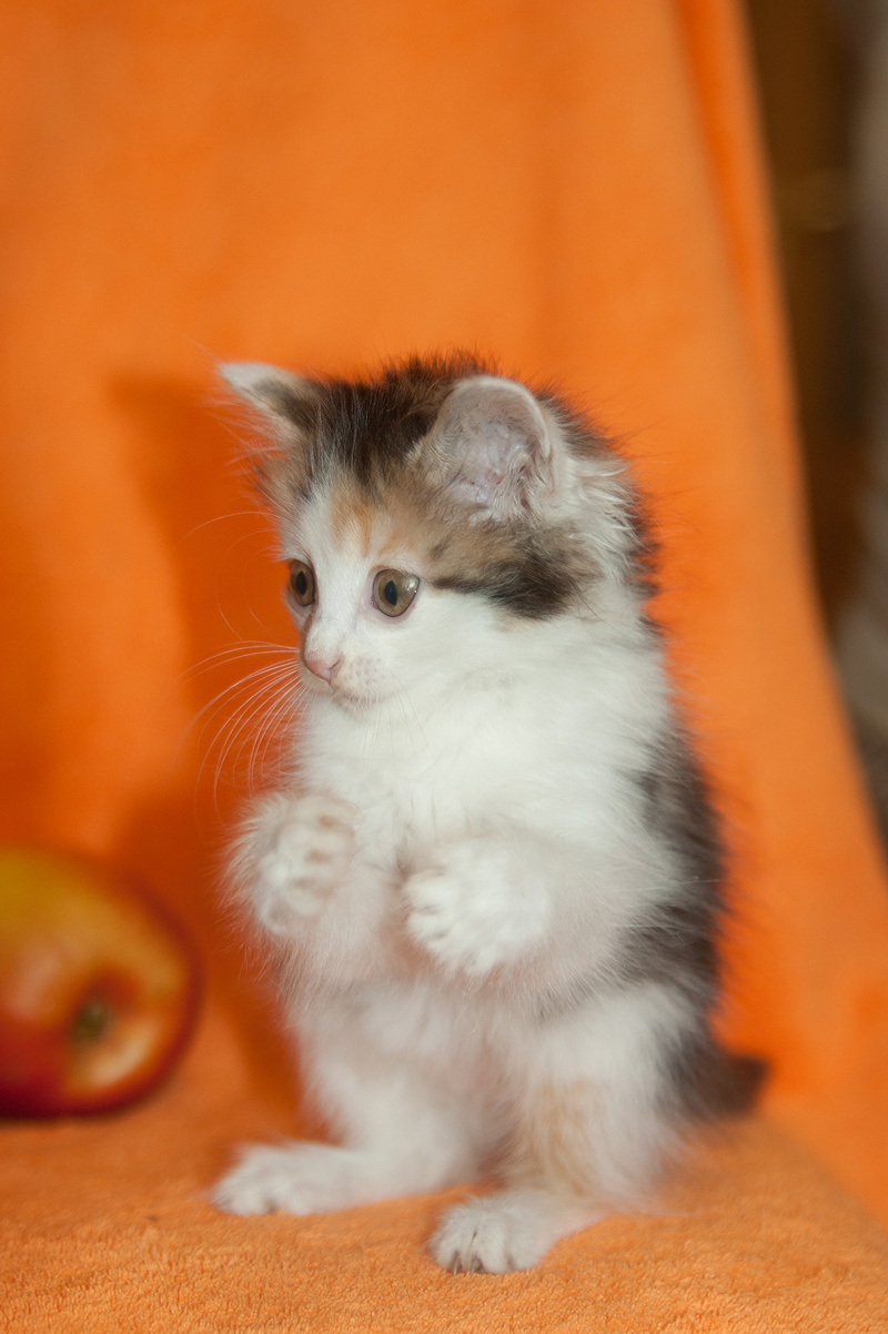 Это Ева. Маленькое очаровательное чудо размером с ладошку. Ей всего 1,5 месяца. Она ещё даже немного пошатывается, бегая на своих малюсеньких лапках. Ева ходит исключительно в лоточек с древесным наполнителем, кушает детский Роял Канин, и спит в обнимку с людьми. Евочка очень нежное и трогательное создание. Она начинает мурлыкать, как только рядом оказывается кто-нибудь живой. А как забавно она играет! Это целый воображаемый мир с кучей приключений и опасностей на каждом шагу! Но побеждает всегда дружба!