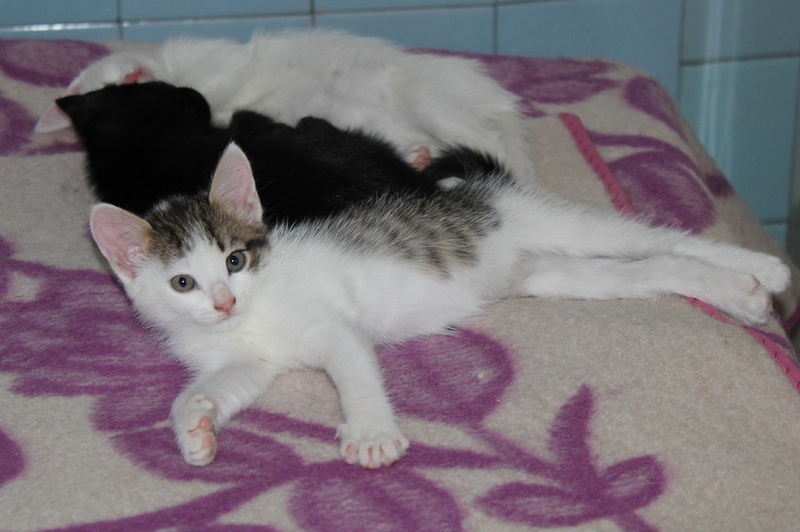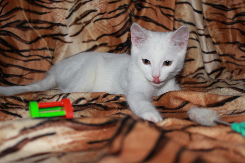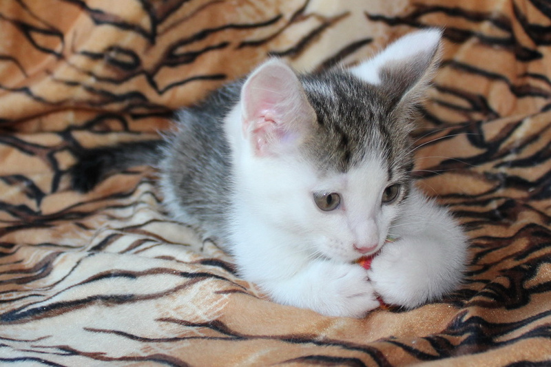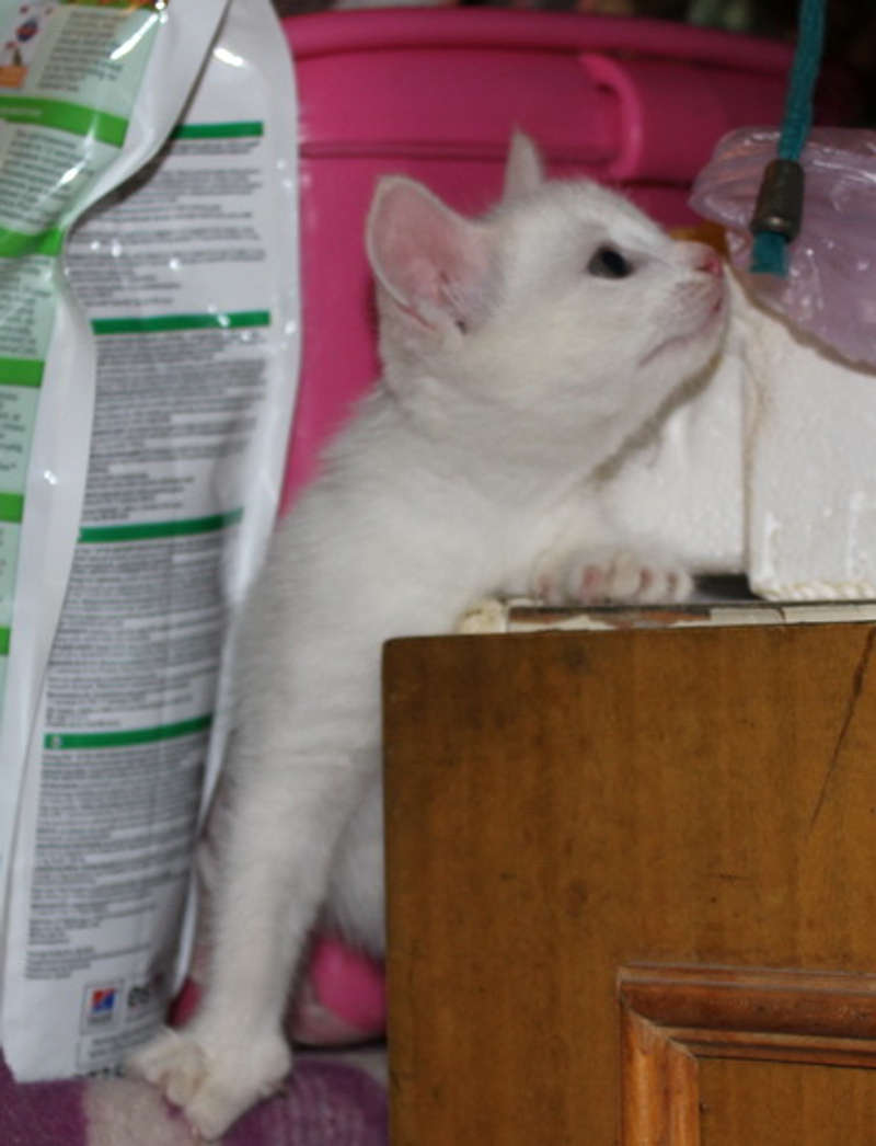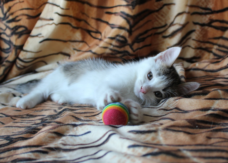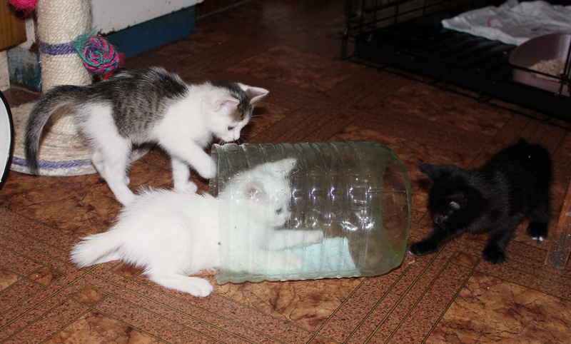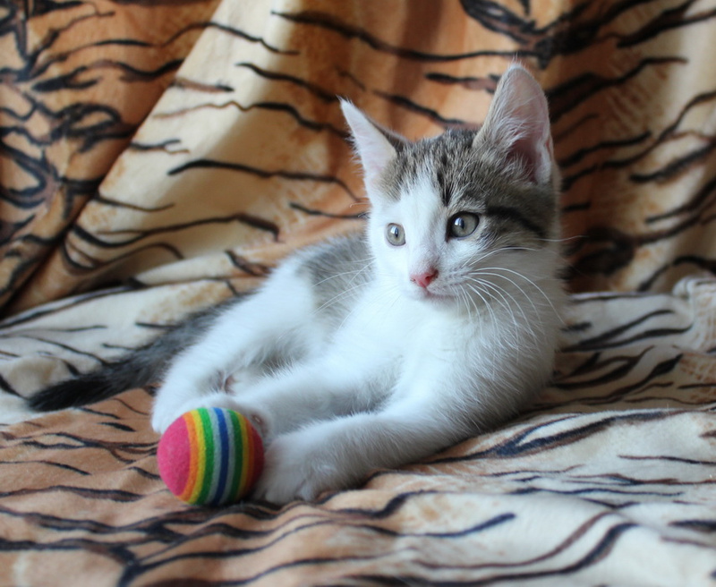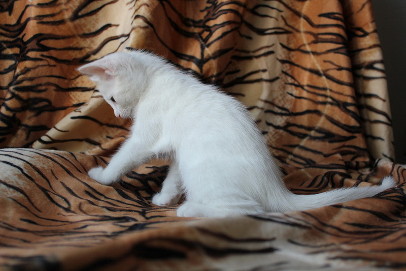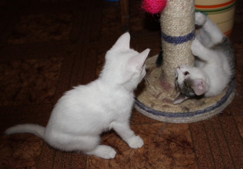 Беляшка. Самая крупная девочка, уже кушает самостоятельно – и влажник и сушку. Была замечена в горшке, как вполне годная к взрослой жизни. Очень самостоятельная барышня. Может поучаствовать в играх двух других сестренок, а может просто посидеть, глядя на то, как они бесятся и подумать о смысле жизни. Иногда кажется, что ей книжки в лапах не хватает, такая это серьезная девица, а иногда – это просто кошачий ребенок, такой же, как остальные.