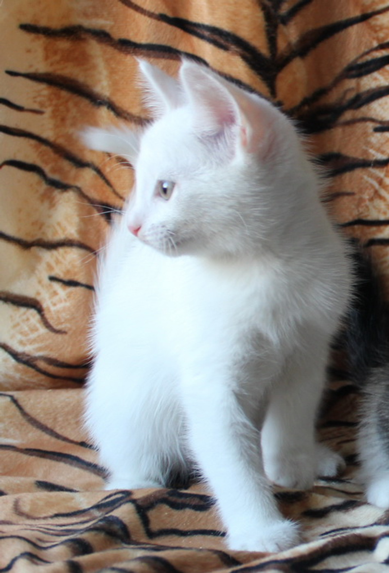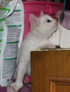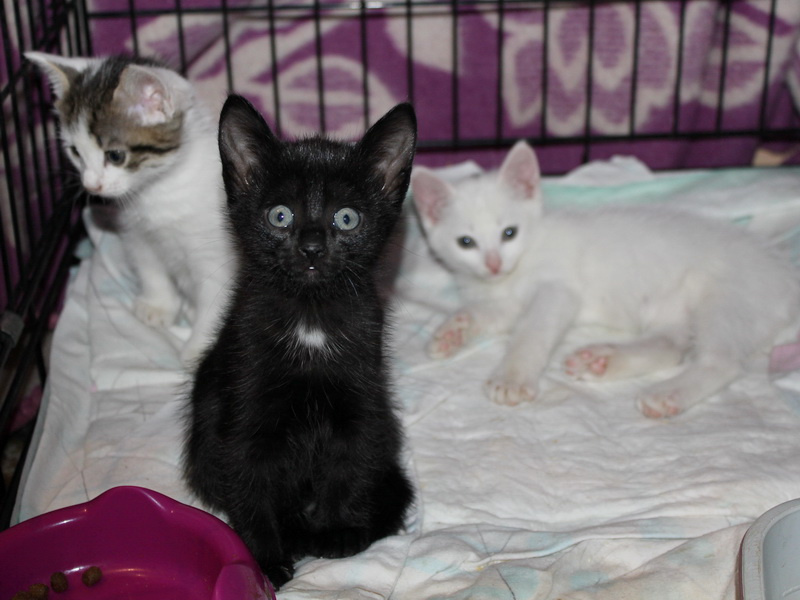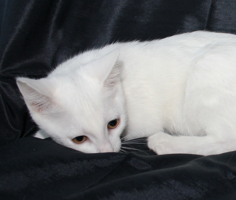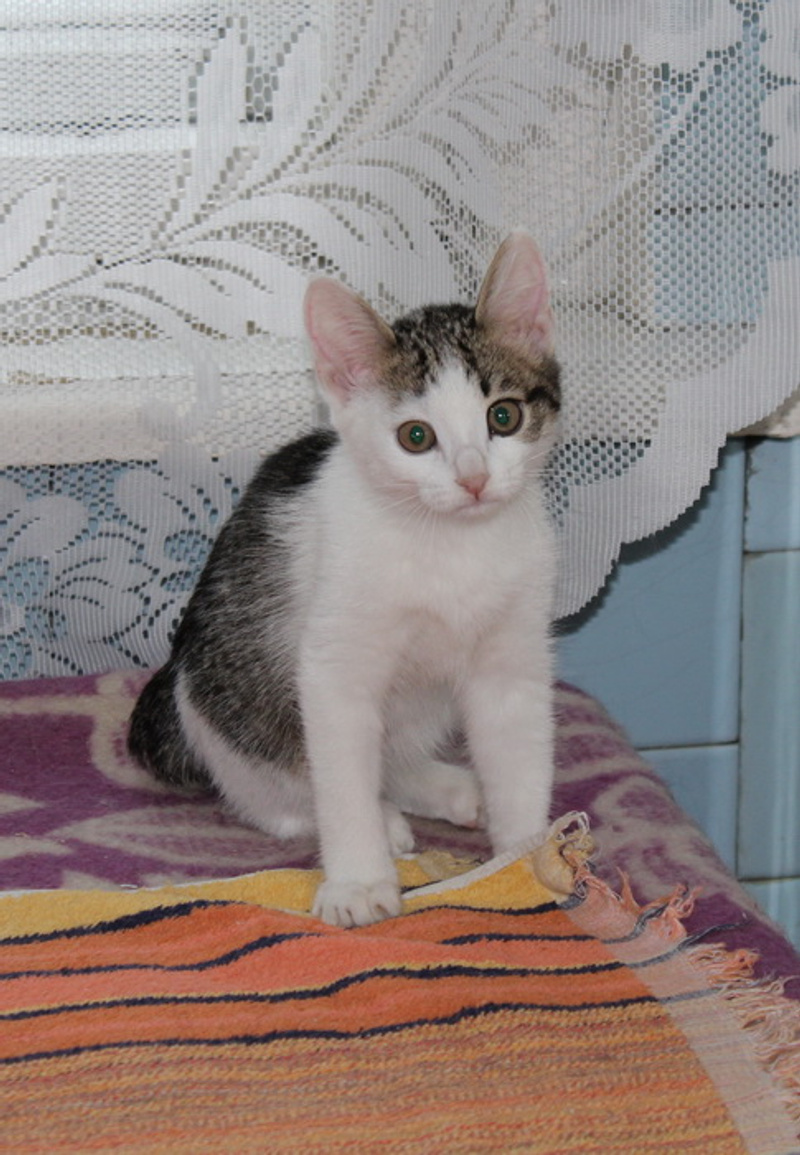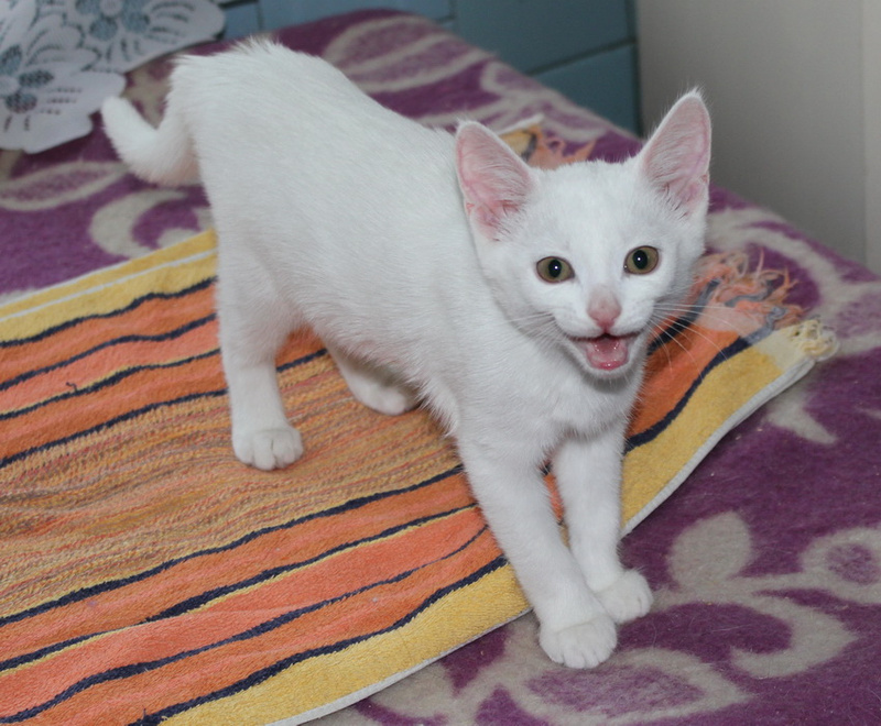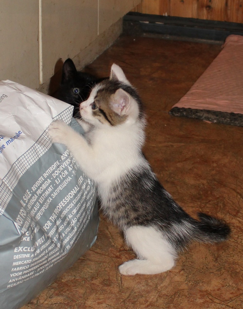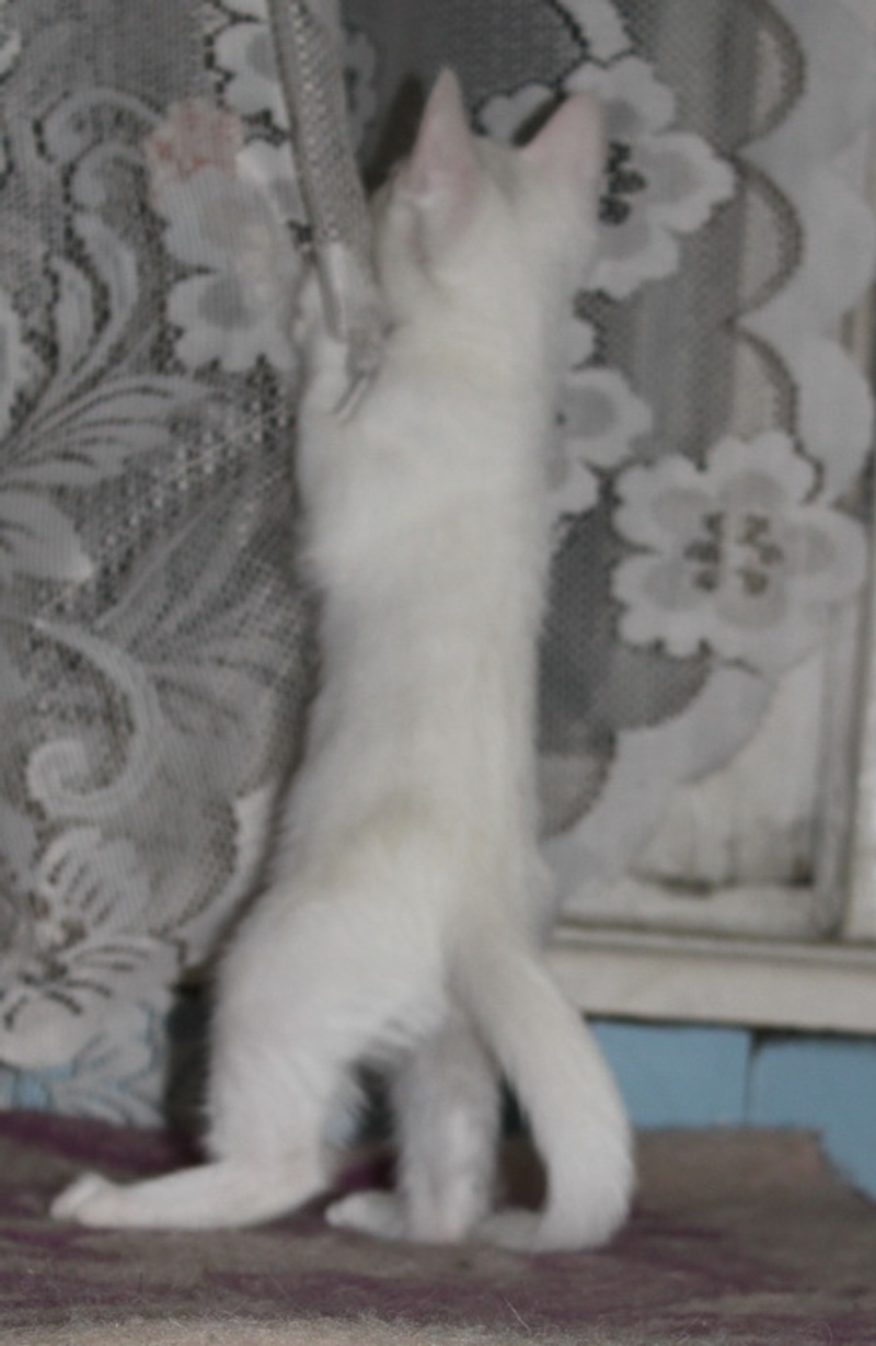 Беляшка. Самая крупная девочка, уже кушает самостоятельно – и влажник и сушку. Была замечена в горшке, как вполне годная к взрослой жизни. Очень самостоятельная барышня. Может поучаствовать в играх двух других сестренок, а может просто посидеть, глядя на то, как они бесятся и подумать о смысле жизни. Иногда кажется, что ей книжки в лапах не хватает, такая это серьезная девица, а иногда – это просто кошачий ребенок, такой же, как остальные.