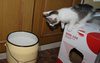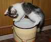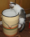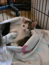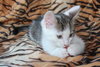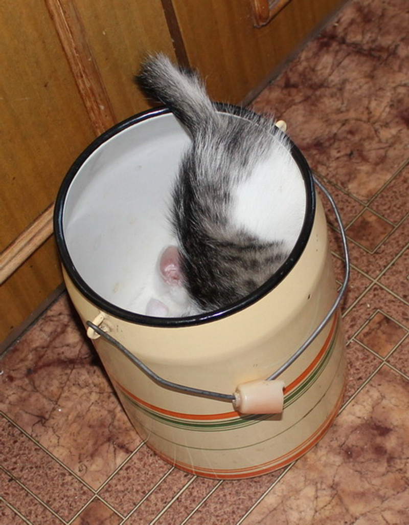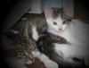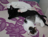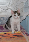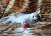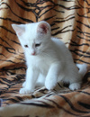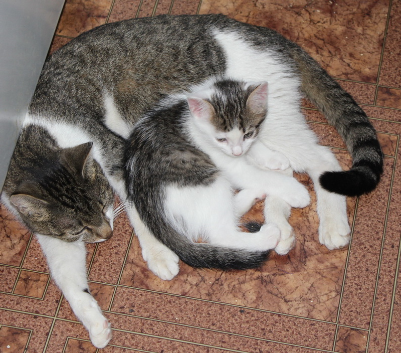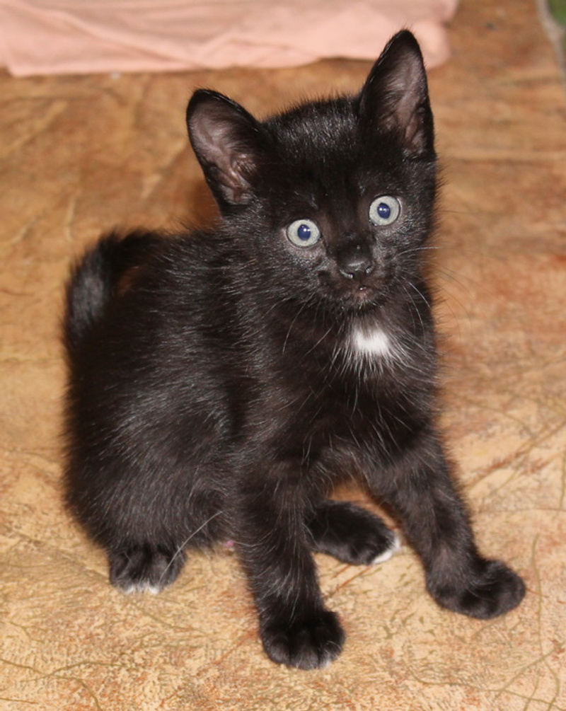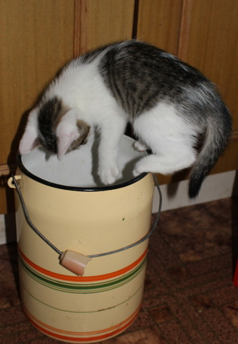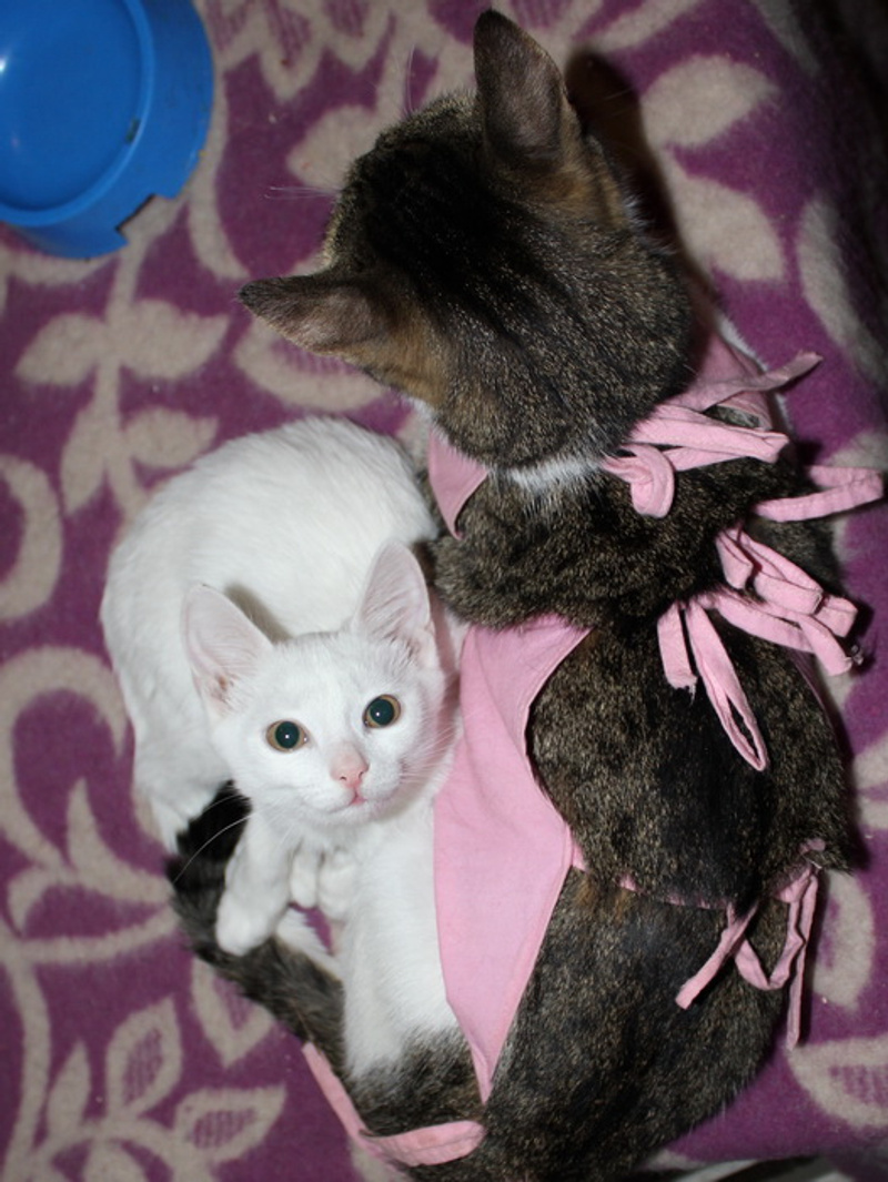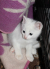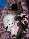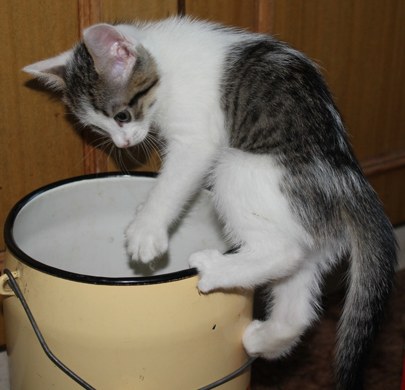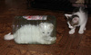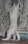 Беляшка. Самая крупная девочка, уже кушает самостоятельно – и влажник и сушку. Была замечена в горшке, как вполне годная к взрослой жизни. Очень самостоятельная барышня. Может поучаствовать в играх двух других сестренок, а может просто посидеть, глядя на то, как они бесятся и подумать о смысле жизни. Иногда кажется, что ей книжки в лапах не хватает, такая это серьезная девица, а иногда – это просто кошачий ребенок, такой же, как остальные.