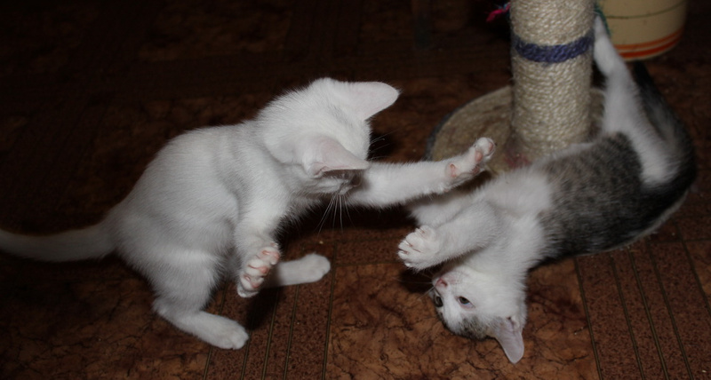 Две другие малявки – что называется «неразлейвода», игры, игры и игры. Им все равно, что посредине комнаты торчат чьи-то ноги, что кто-то ходит туда-сюда, пытаясь убраться и при этом не наступить на котявок. Они заняты друг другом и игрой . А играть могут целый день с небольшими перерывами на сон и еду. Эти двое умудряются играть даже в тесной клетке, и нет ничего более захватывающего, чем их игры. Наблюдать за ними можно часами.