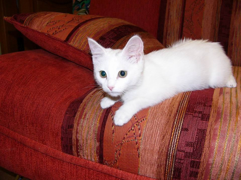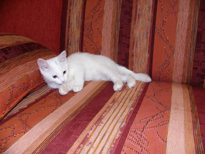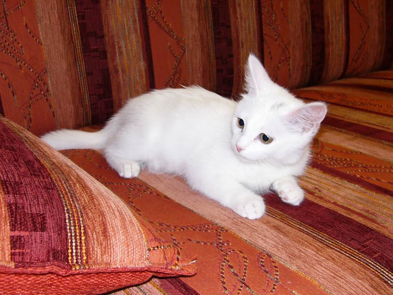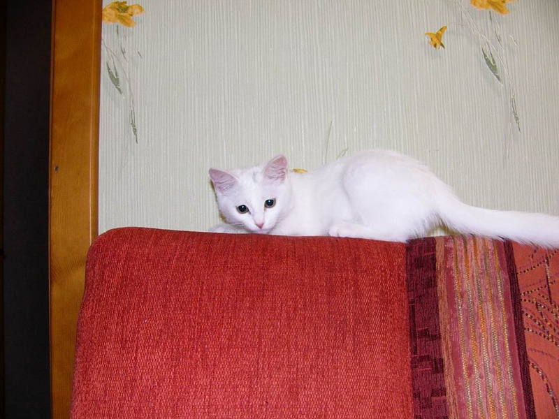 Белоснежный котёночек с маленьким пятнышком на лбу, девочка, возраст 2месяца, весёлая, ласковая и очень игривая, отдам в добрые руки, к лотку приучена.