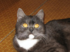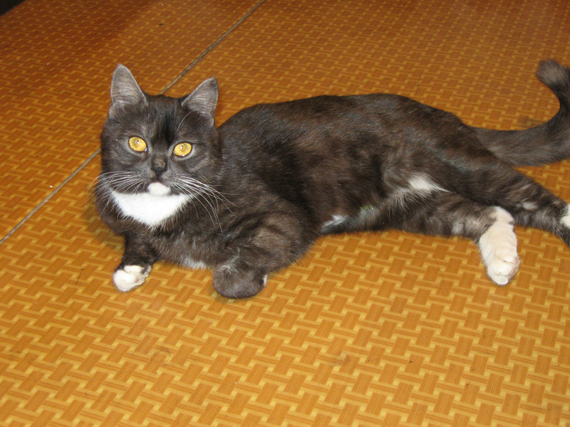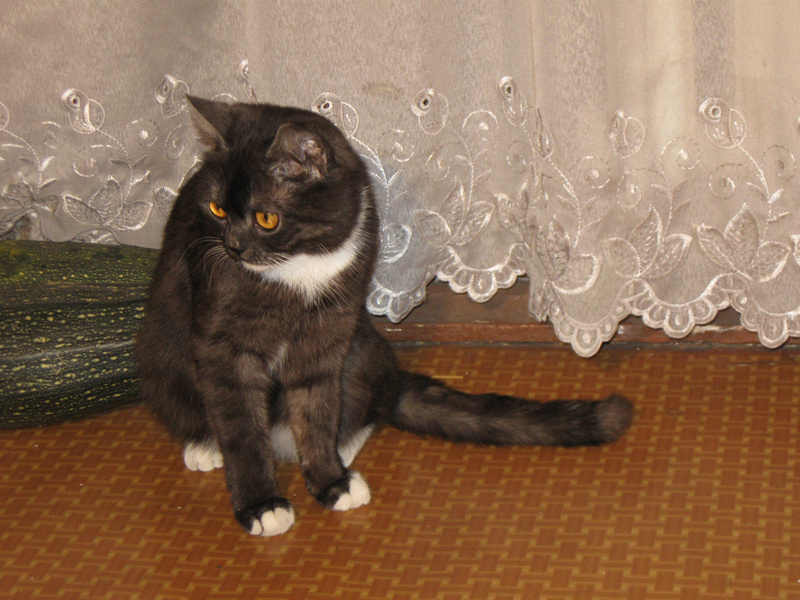 Окрас очень интересный: черная, а подшерсток белый, на свету на лапах просвечивабт полоски, а на боках-пятнышки. Кошка крупненькая. Мордочка выдает помесь с британцем.