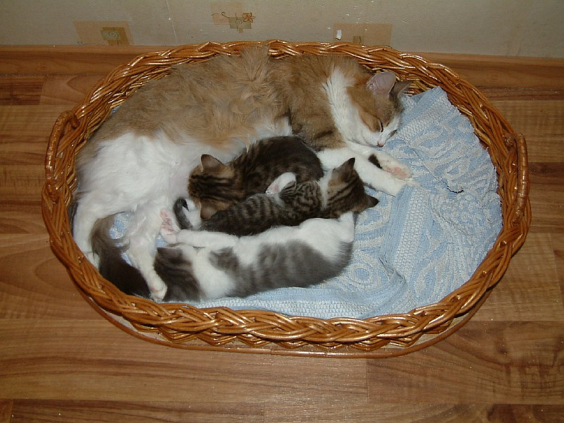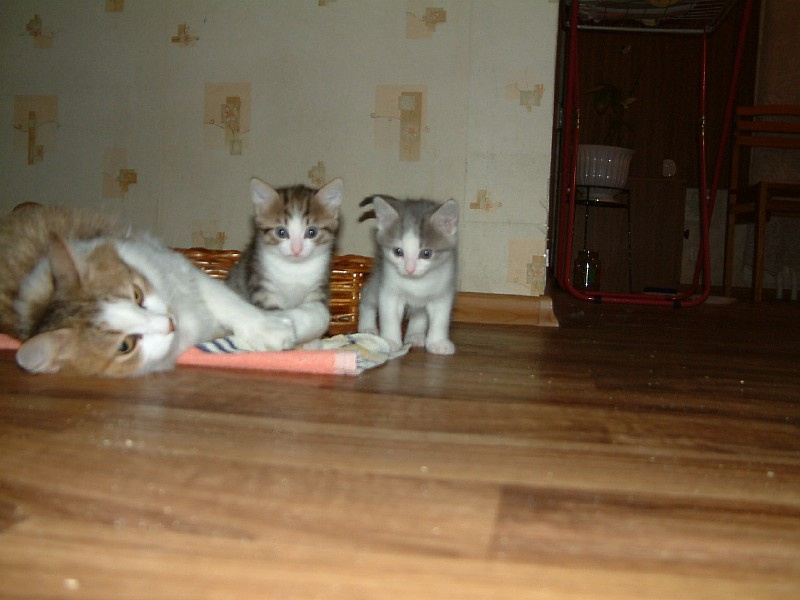Летом, ещё в июле к нам на дачу стала ходить кошка. Ну мы её маленько подкармливали. Спрашивали соседей, смотрели объявления по дачам, но так и не узнали чья она. По выходным когда подъезжали к даче, она уже ждала возле дома. Ну и в итоге по осени решили взять её к себе домой. Кошка оказалась очень умной. Никаких проблем с ней. Но самое неожиданное , что 29 октября родила трех котят. Две девочки и дымчатый мальчик. Больше всех обрадовался сын , он ещё первоклассник.