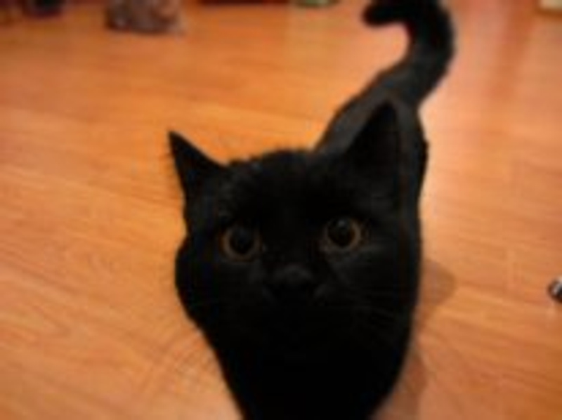 Молодой кот, чисто черный с большими оранжевыми глазами.
