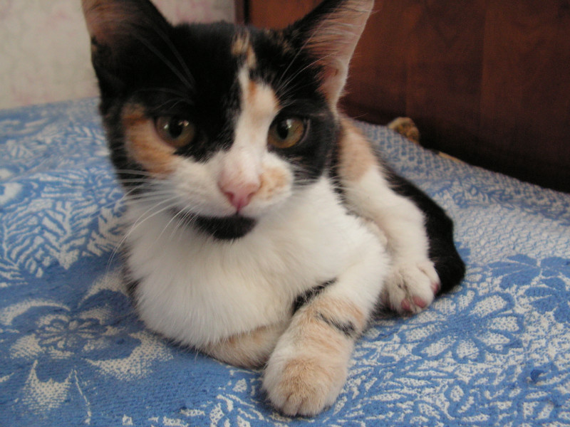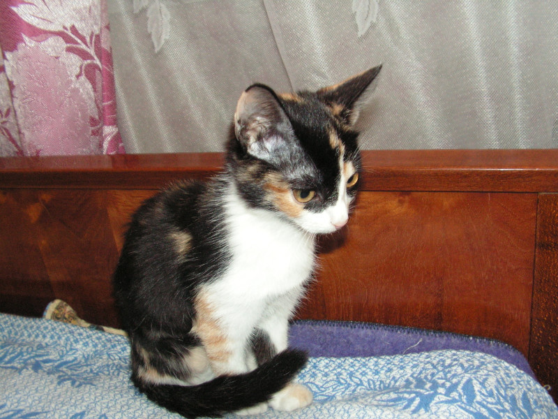Отдадим в ответственные руки очаровательную кису, возраст - 3,5 мес. Очень игривая и активная, но в то же время ласковая. Ходит в лоток. Окрас трехцветный - рыжеполосатый, черный и белый. Глаза ражие!!! Звоните 8-913-935-01-четыре-шесть.