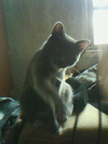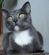 Внешне напоминает фарфоровую статуэтку, этакую кошачью балерину, на тонких стройных ножках, грациозную и привлекательную.Одета в красивую голубую шубку с беленьким воротничком и муфточкой. По характеру кошечка ласковая, ориентирована на человека.
