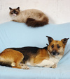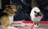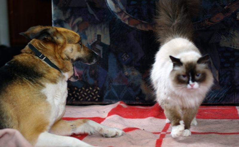 Выяснилось, что наш сиятельный Пан прекрасно уживается с неагрессивными собаками. При этом он не лезет к ним общаться, просто на них не реагирует. Почему так - странно, ведь он жил исключительно в окружении кошек. Возможно, они ему просто надоели.