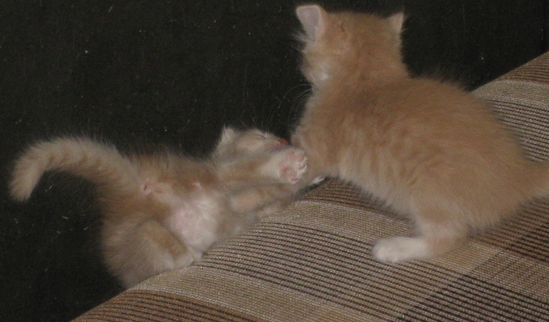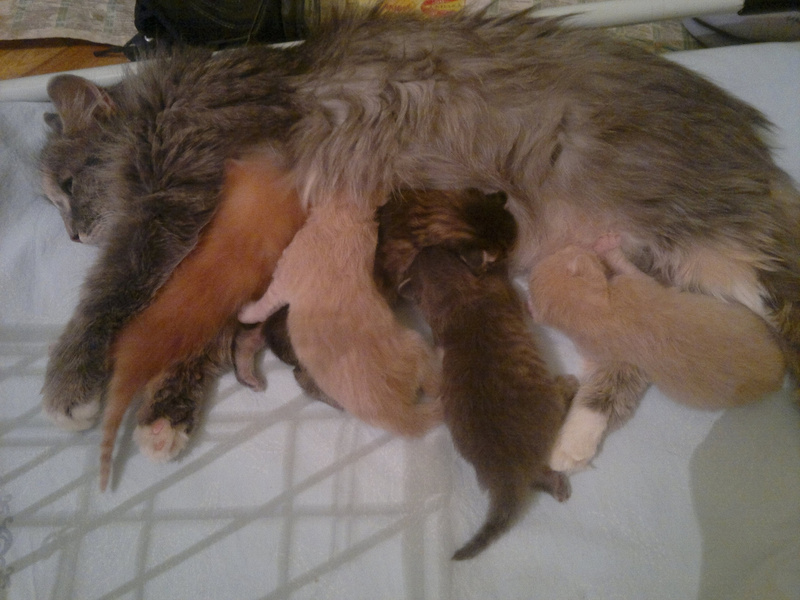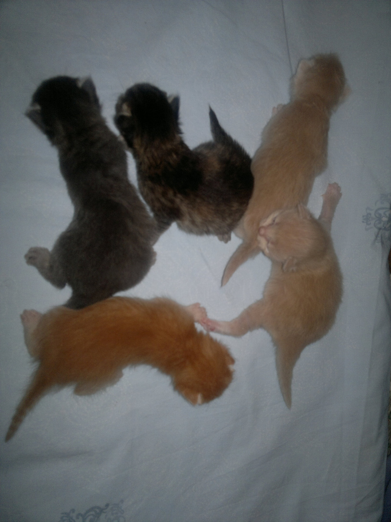 В марте этого года в подвале по улице Такой-то (имя улицы изменено в целях конспирации) была найдена очень беременная кошь. Спустя некоторое время 25 марта в 9.00 по Московскому времени кошка произвела на свет пятерых котят. Пол котят до сих пор остаётся загадкой. Все малыши и мама чувствуют себя хорошо. Нашей теле-кото-радио-компании удалось раздобыть несколько снимков счастливого семейства.