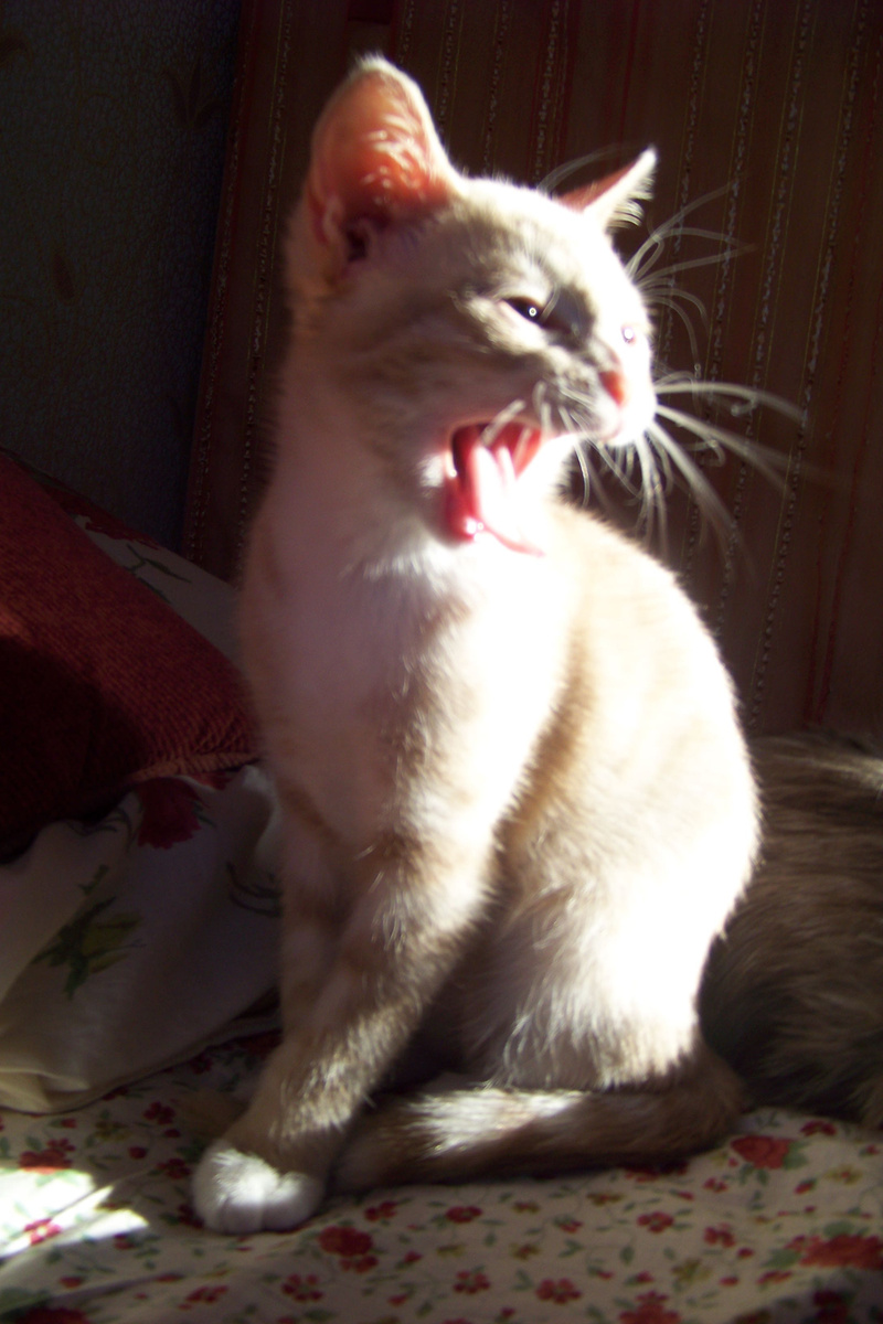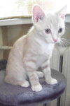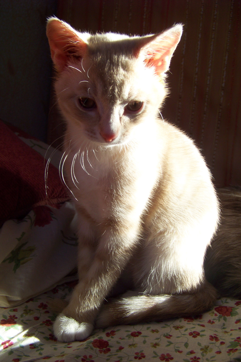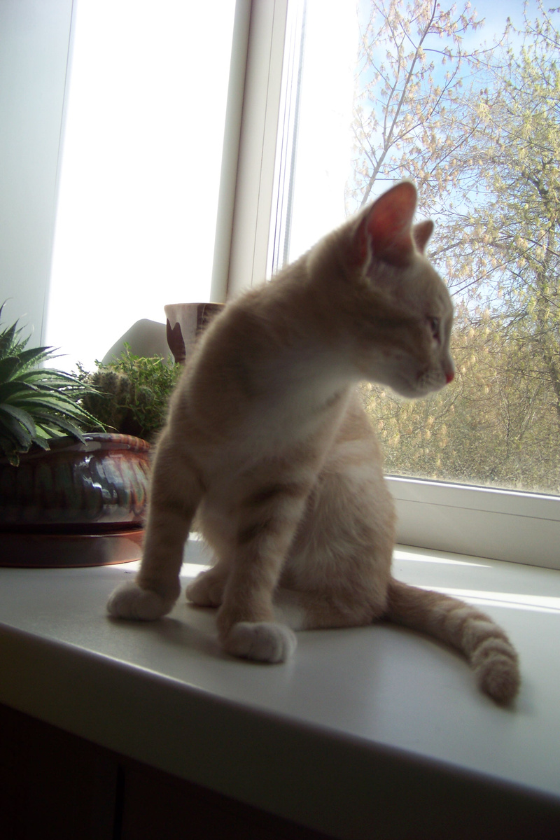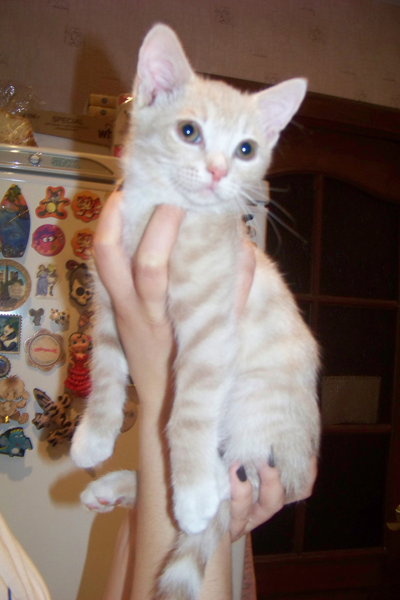 Громким криком привлекая к себе внимание, был подобран с улицы и временно поселен в квартире двух взрослых: шипящей кошки (на нее он просто не обращает внимание) и молодого котика (с ним он дружит и играет).