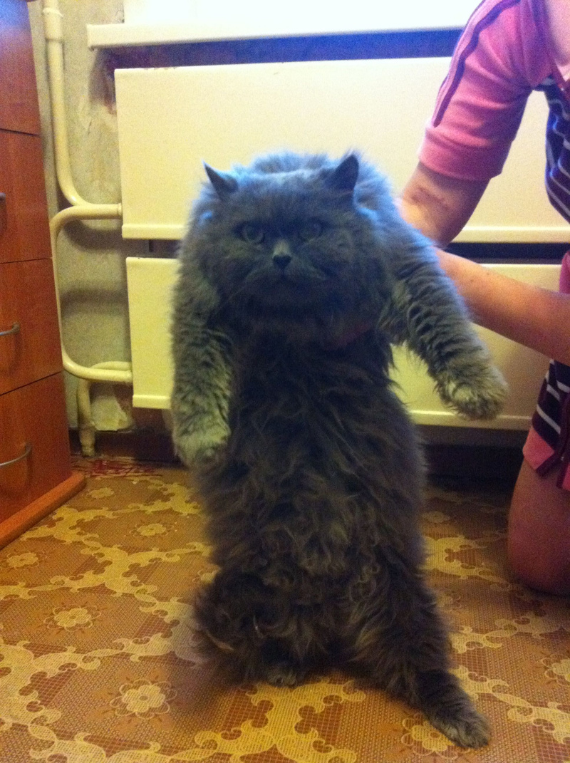 Серый, очень пушистый, морда британца, шерсть сибиряка, глаза желтые.