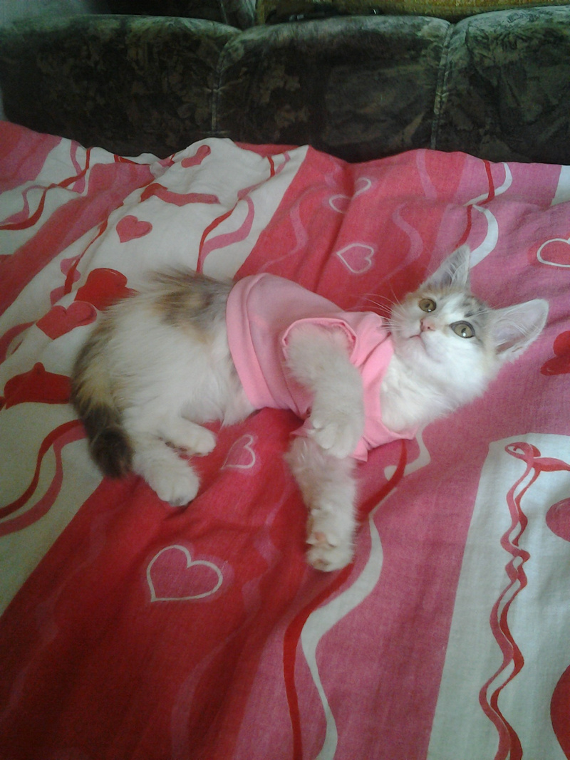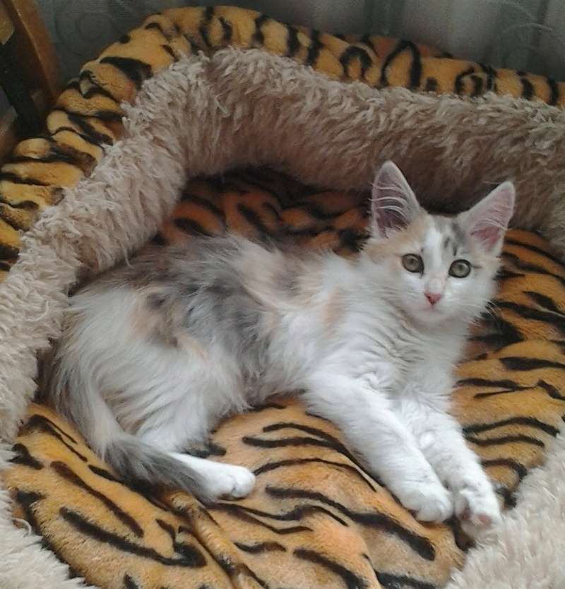 Кошечка Трикси 2,5 месяца. Трехцветная: на белом персиковые и дымчатые пятна (очень нежные цвета), шерстка средней пушистости, глазки желтые с черной подводкой. Трикси еще маленькая, но уже с характером, умненькая, отлично знает лоток. тел: 375-17-25 Александр