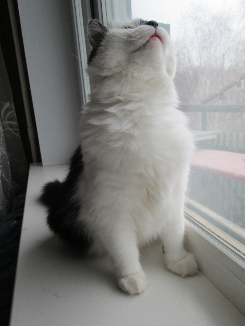 Киса очень любит общение. Стоит только заговорить с ней, так тут-же начинает тарахтеть, солидно, как Харли-Дэвидсон. Когда гладишь ее, в благодарность лижет руки. Шерсть мягкая и приятная на ощупь.