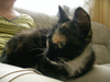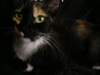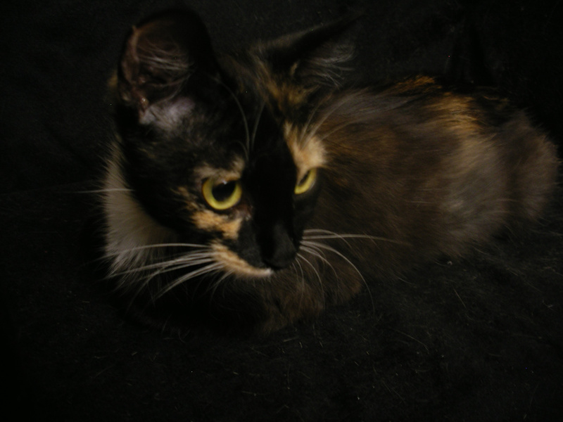Для трехцветной кошки у нее просто потрясающий окрас - основной цвет черный, есть яркие рыжие пятна и белые голифики. На черной мордочке белые пушистые усы.