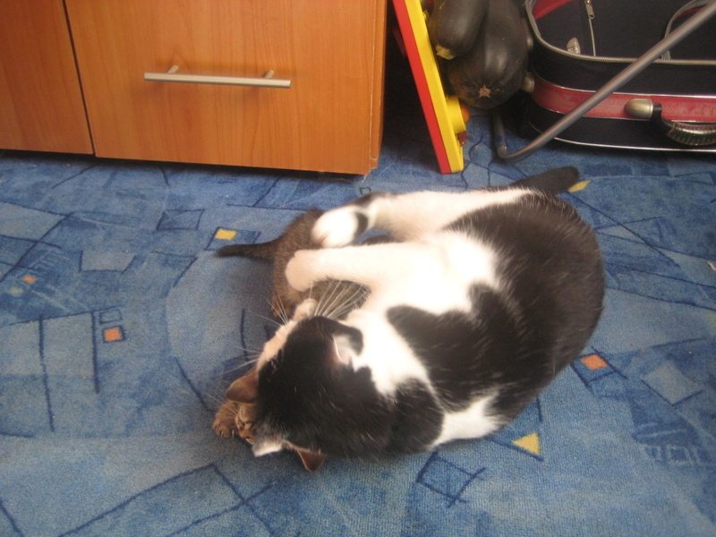 он очень хорошо ладит с другими животными,любит деток маленьких,а как он всех с утра будет это видеть надо