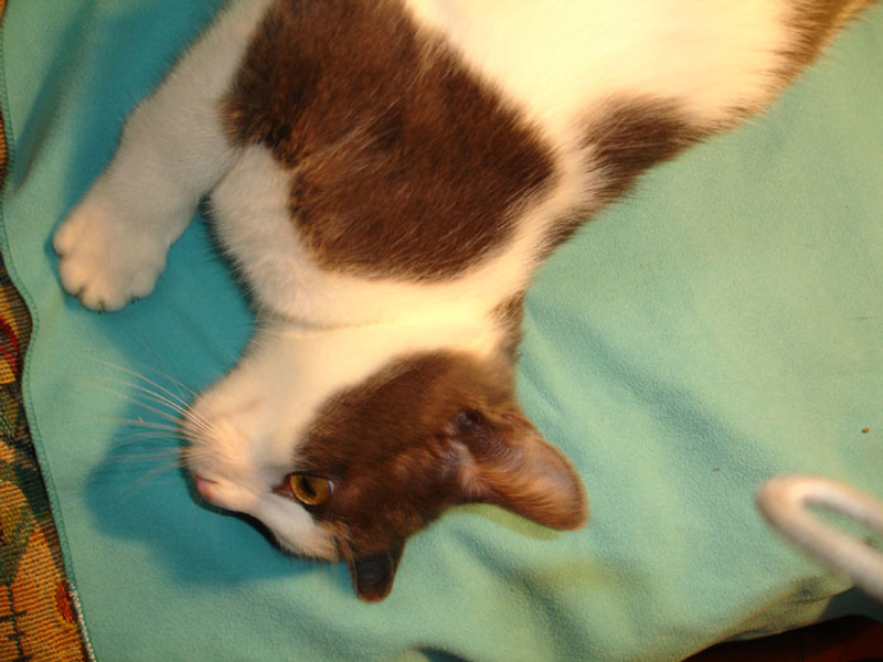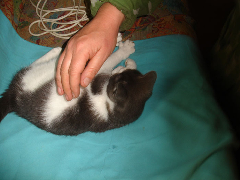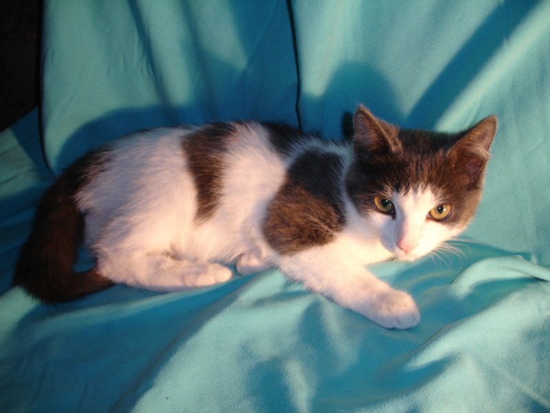 Его история в ссылке в моём профиле (группа ВКонтакте) - в совсем "детском" возрасте был выставлен на улицу, так как разгар "дачного сезона" мешал совместить грядки и котёнка. Были выбраны грядки, а милейший и спокойнейший Тиша отправлен на улицу без каких-либо зазрений совести.