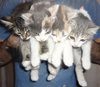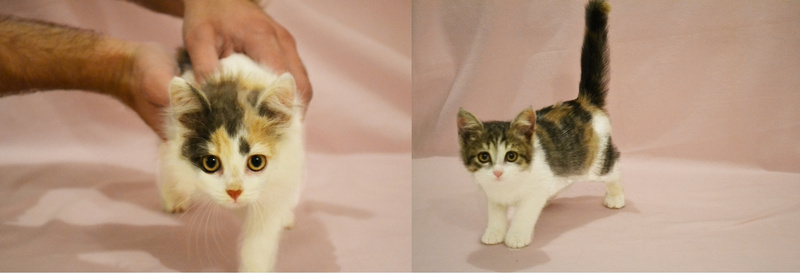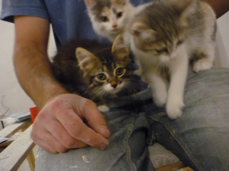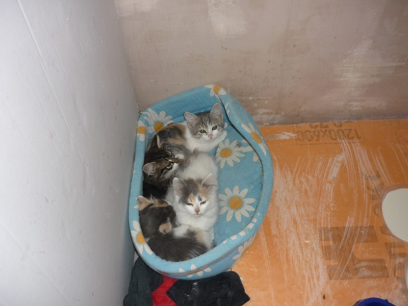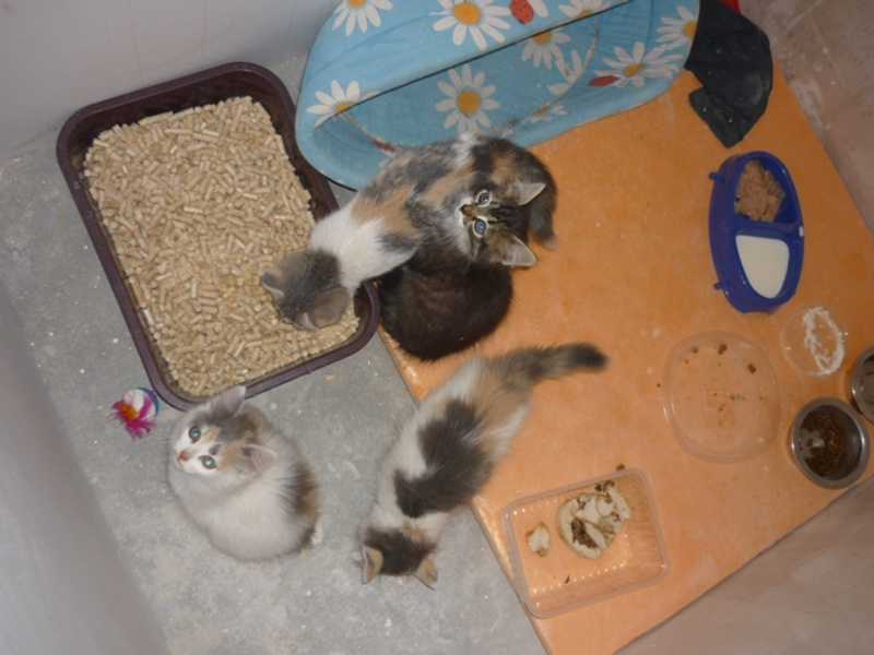 Около дома в трассе силового кабеля нашла 4х котят. Были настолько истощены, что кидались даже на хлеб, скелетики обтянутые шкуркой. Забрала к себе в квартиру-новостройку, где идет активный черновой ремонт, штукатурка-электрика, стекловата, горы грязи и прочие прелести. За месяц пристроился только один котенок, еще три малыша отчаянно нуждаются в собственном доме. Откормила их, выглядят здоровенькими, хотя чумазые, нет возможности помыть, да и смысла нет, везде пылища-грязища. Приучила к лоточку. На вид котейкам около 2х месяцев. Две трехцветные кошечки и черный котик. Котик умеет делать глазки как кот в сапогах из Шрека, клянусь!)) Все мурлычут как стадо тракторов, очень ласковые и общительные.