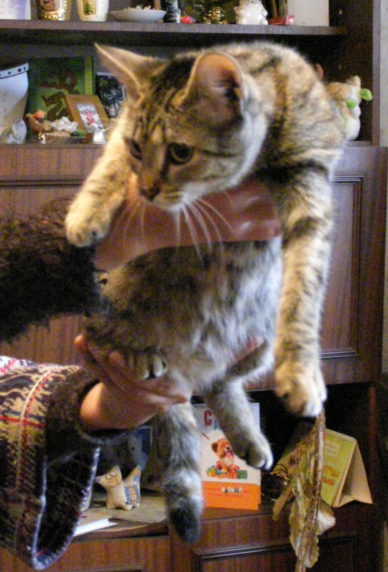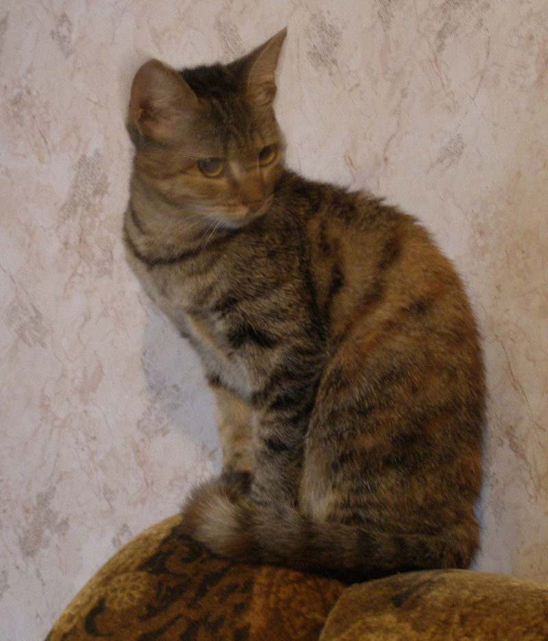 Шерсть у парнюги бархатистая, в качественном корме знает толк, с наполнителем весьма по-свойски обходится. Очень гордо несёт свои большие уши, умеет кокетничать огромными глазами, мурчав и изящен, как статуэтка. Окрас описать сложновато: к полоскам приплюсовываются штрихи песочно-рыжей краски. В общем, маскироваться в саване - самое оно. А в Сибири дождливой осенью как-то не очень.