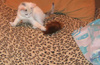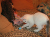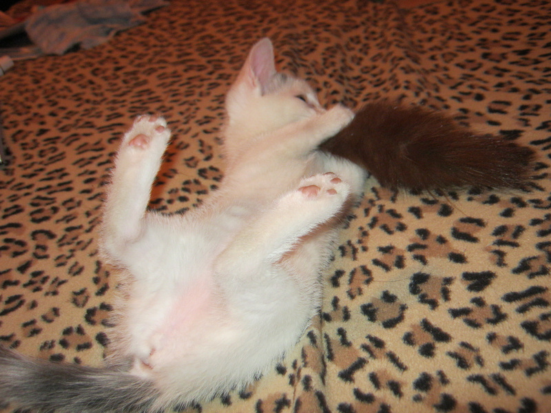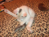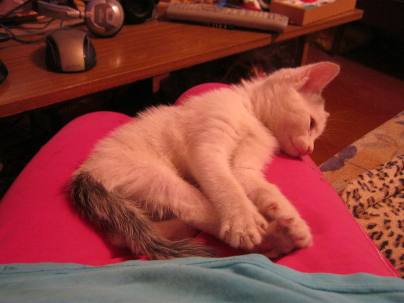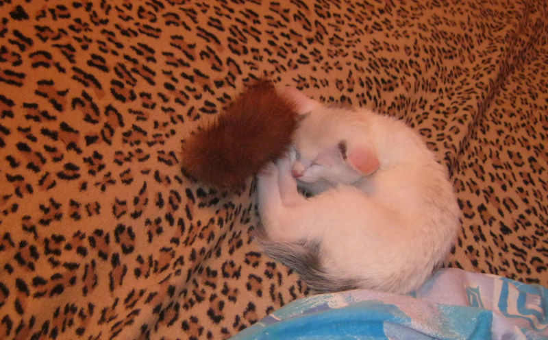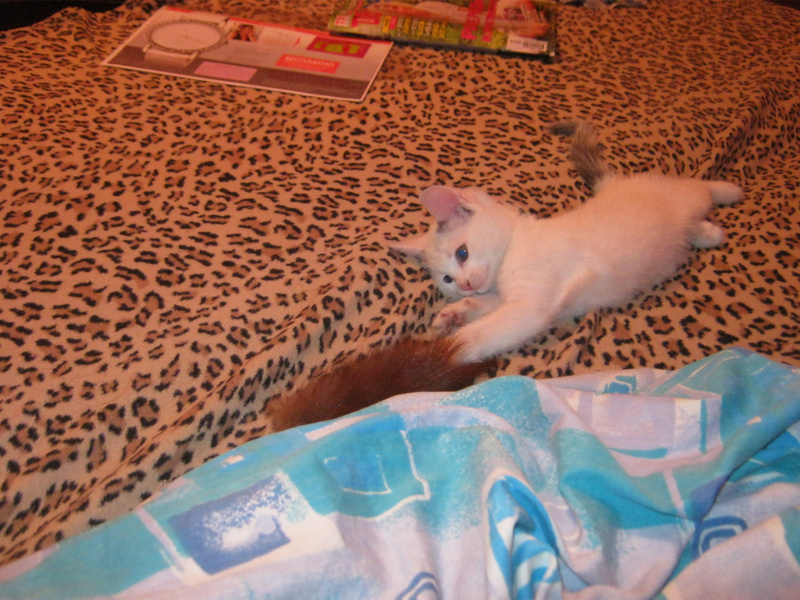 Спасли сегодня котенка. Сидел под киосками, возле рекламы с кошачьим кормом(!) - мяукал, звал на помощь..Продавцы сказали, что сидел с самого утра! Выманили и сцапали..Видно было, что настрадался и напуган. И вот я "собачница" без "кошачьего" опыта притащила его домой. Мыть котенка пока не стала. Сначала малыш прятался, боялся всего, а потом освоился. Особенно на диване ему нравится, и поиграть и поспать...Не знаю, как ночь пройдет, он как-будто ищет маму-кошку, ходит и мяукает, беспокоится..Котенок интересный, шерстка, как у норки окрасом..Ищу ему хозяина хорошего..У меня астма, от кошек плохо, надо передержку искать..