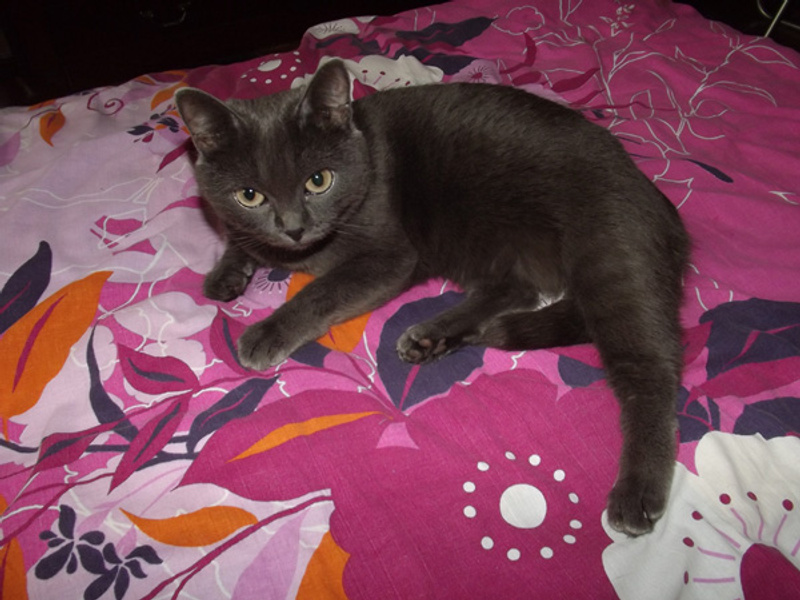 Красивая и ласковая кошечка Сашими (или попросту Сушка), цвет голубовато-серый без единого пятна, 3 года, стерилизована, спокойная, ласковая, к лотку приучена (древесный наполнитель), кушает Вискас.