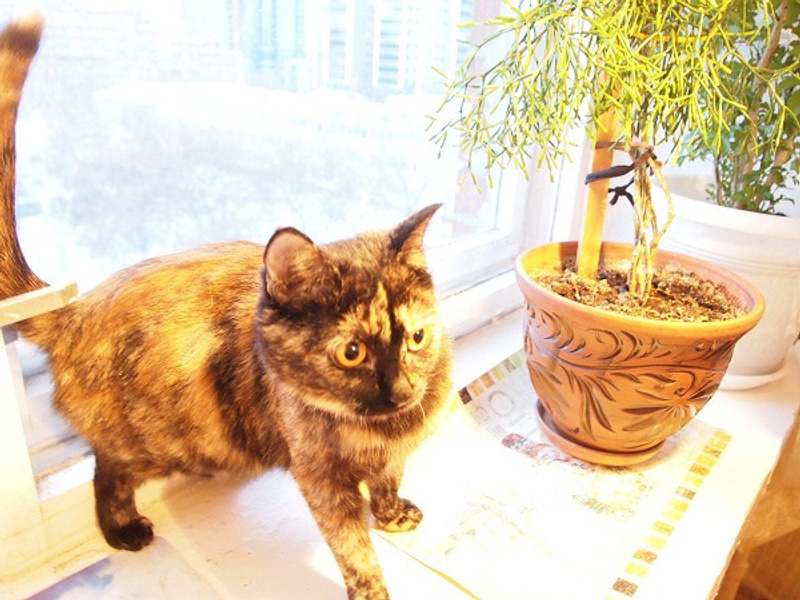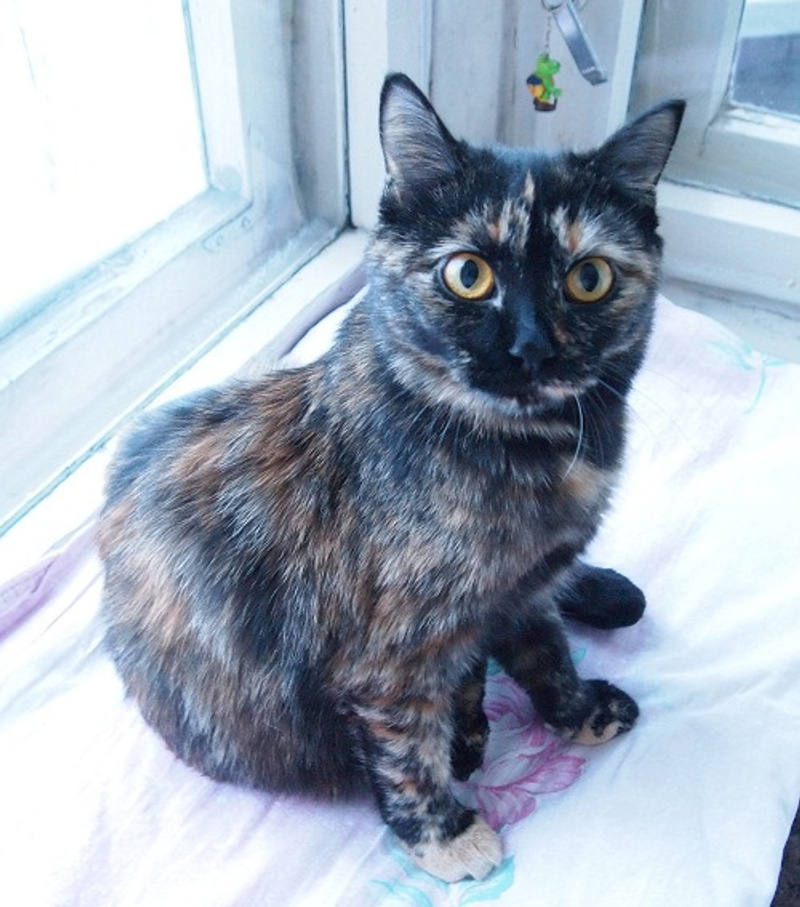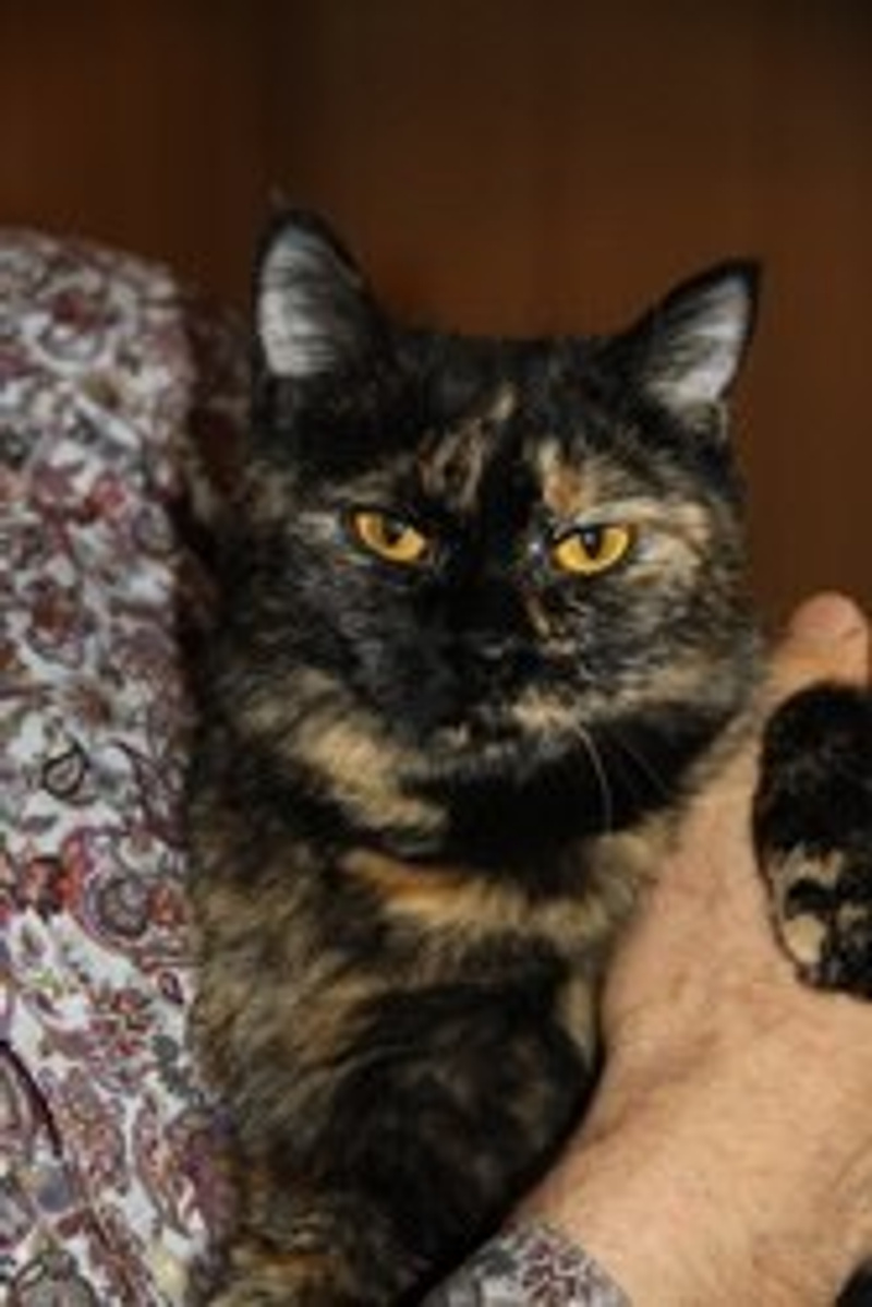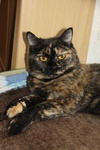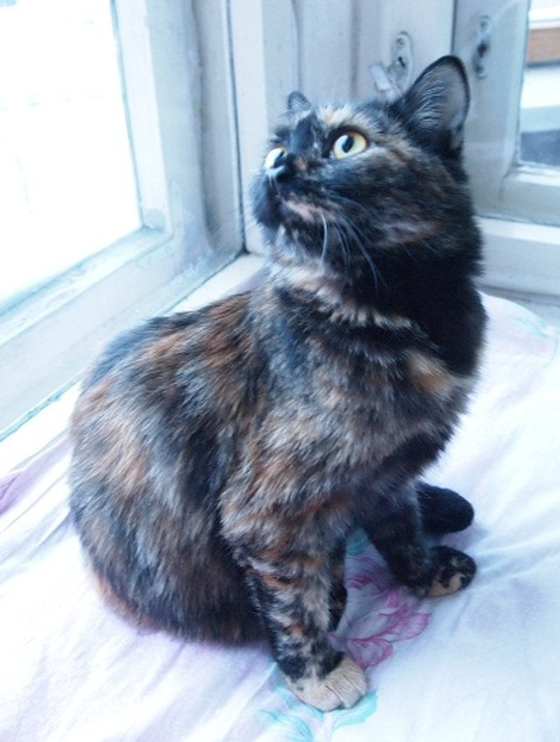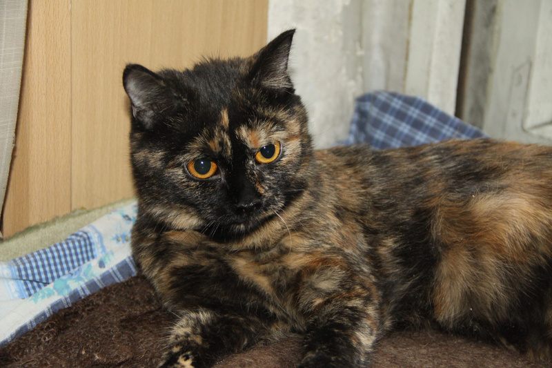 Муся — черепаховая кареглазая кошка, энергичная, хорошая мышеловка. Любит играть, но на руки идет только к хозяину. Родилась домашней, но котенком была брошена на рынке. Поэтому ценит тепло, общество, нуждается в ответственных хозяевах.