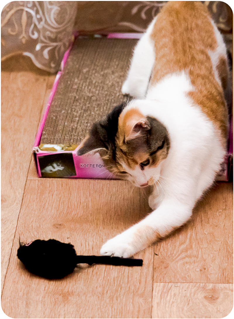 Обожает игрушки всех видов, с удовольствием пользуется когтеточками.