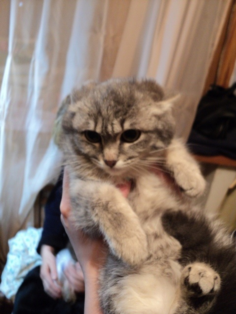 На руках Анфиса сидит спокойно, ластится, но если отпустить, то убегает и прячется.