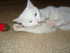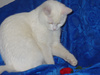 Любит играть, смотреть телевизор, иногда пьет воду с лапки, предварительно обмакнув ее в миску.