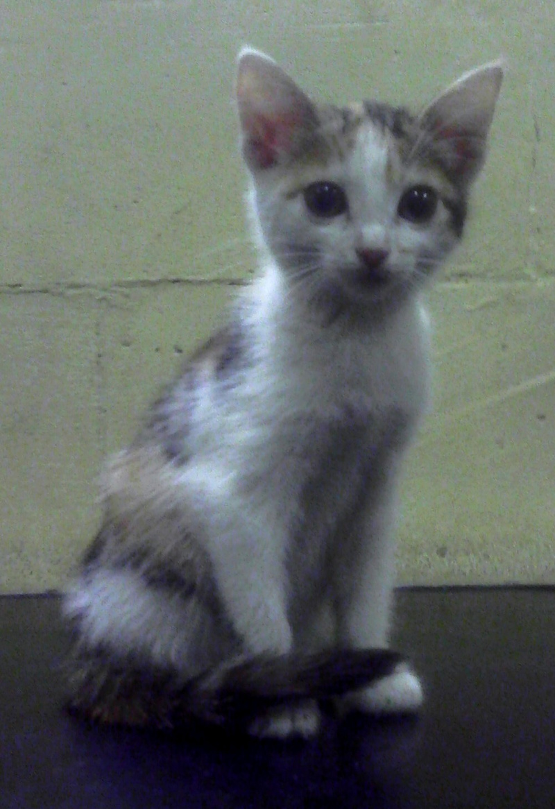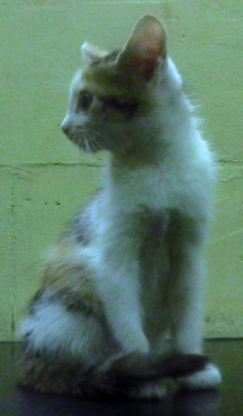 Трехцветная (белый, серый, рыжий) кошечка, примерно 2-2,5 месяца. Подобранец, здорова, справка из ветклиники есть, по желанию будущих владельцев, привьем. Ласковая, спокойная. У себя оставить не можем по причине наличия трех котов и отсутствия достаточных площадей для четвертого:)