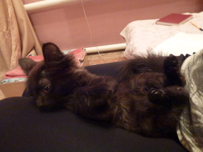 Безумно любит,когда гладят по животику, а еще любит спать на спине!