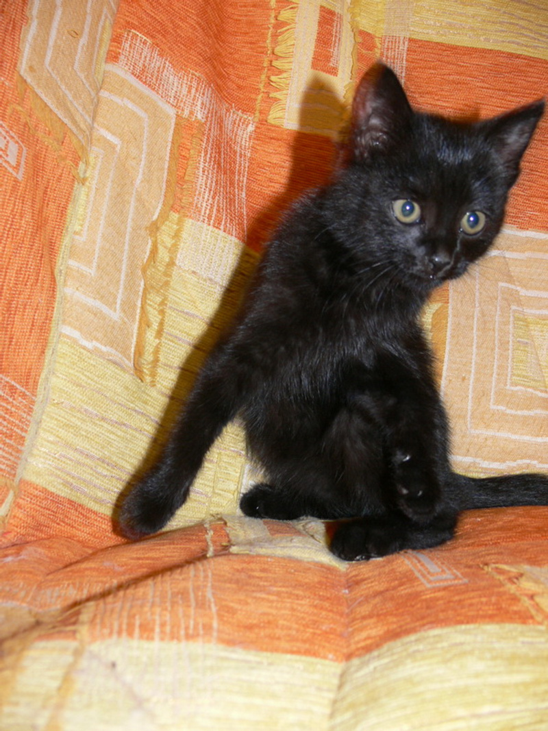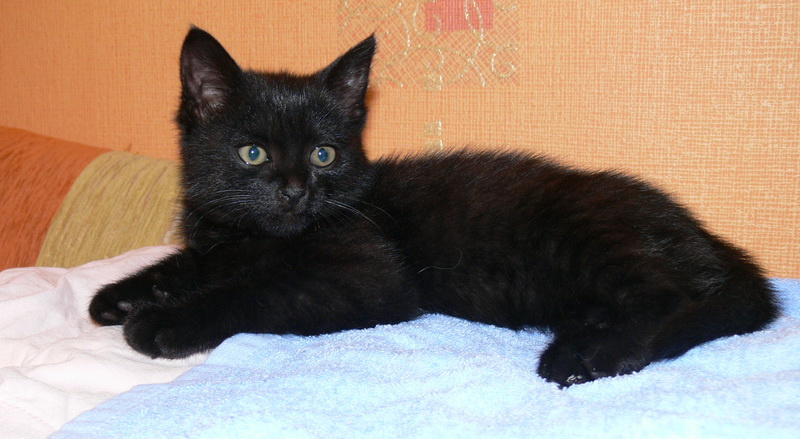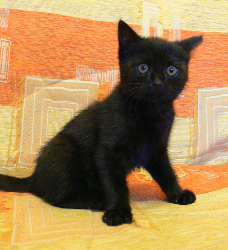 Маленький черненький мальчик. Ему примерно 7 недель, вес 1 кг, здоровенький такой малышок. Играет мячиками, гоняет взрослых котов, себя в большом зеркале, носится как ураган. Когда устает обязательно бежит ко мне и прижимается всем своим маленьким тельцем и поет песенки.