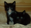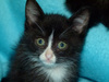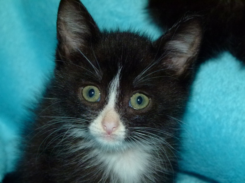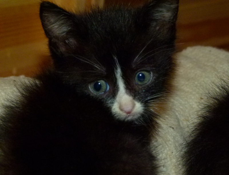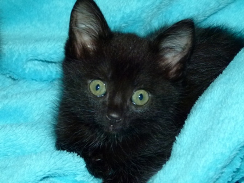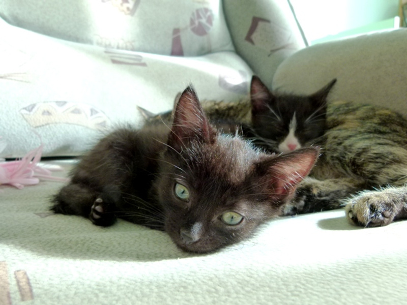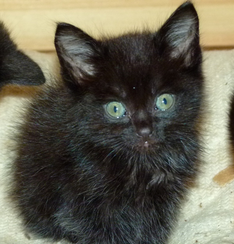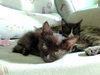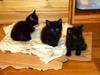 А вот собственно сиротки. Им около месяца, помещаются на ладошке. Вроде бы все - девочки, все чёрные, но одна с белыми отметинами. Едят хорошо паштет и сушку для котят Роял Канин. С туалетом пока мимо, но это дело несложное, 2-3 дня и научу (UPD.: уже поняли, что такое туалет, уже начали ходить). От блох и прочего обработала.