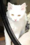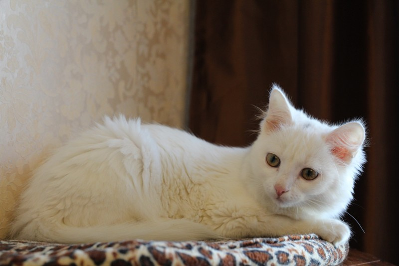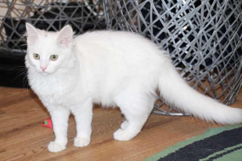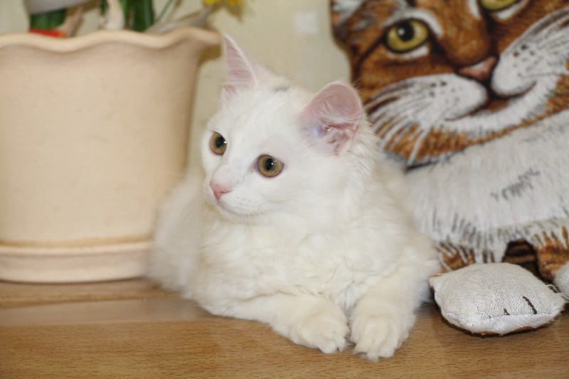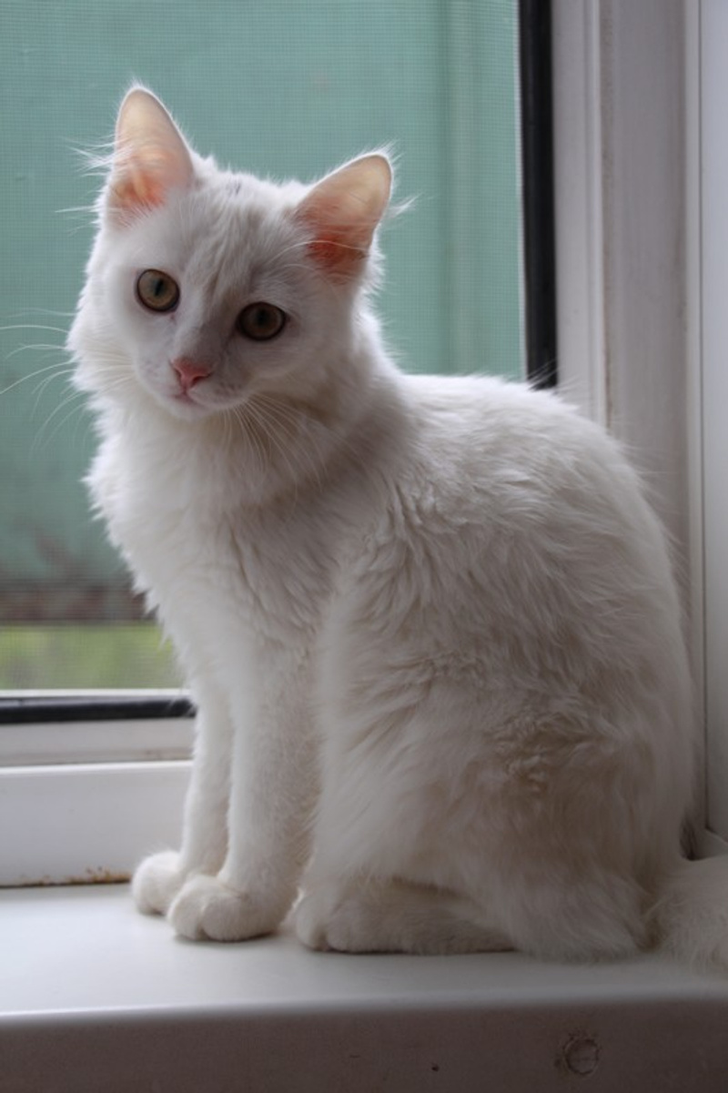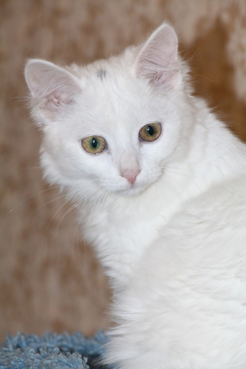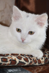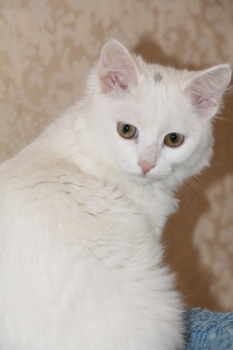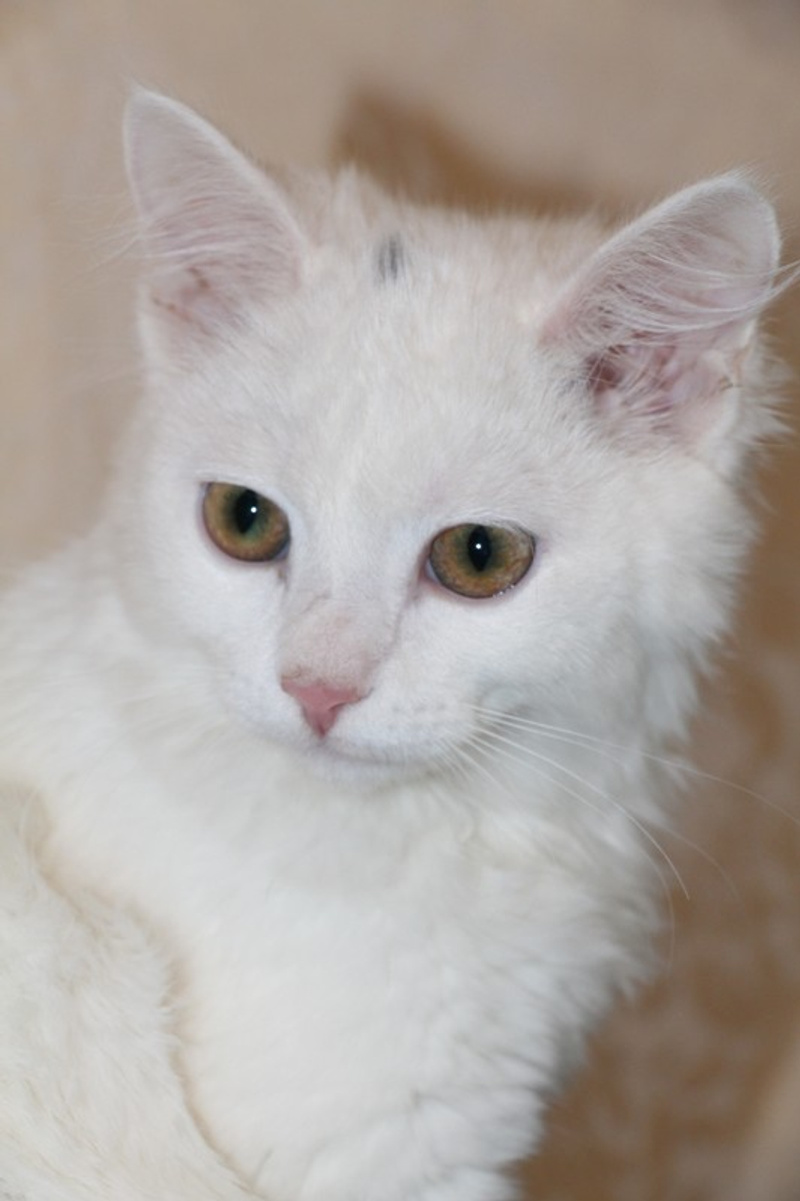 Ангелина маленькое, белое облачко. Возраст примерно месяца 4. Белая, пушистая шерстка у Гели очень мягкая, на ощупь как пух. Она очень ласковая, игривая, задорная. Любит когда ей оказывают всяческие знаки внимания. Кушает сухой корм, лоточек знает на отлично, проглистогонена, скоро будет привита.