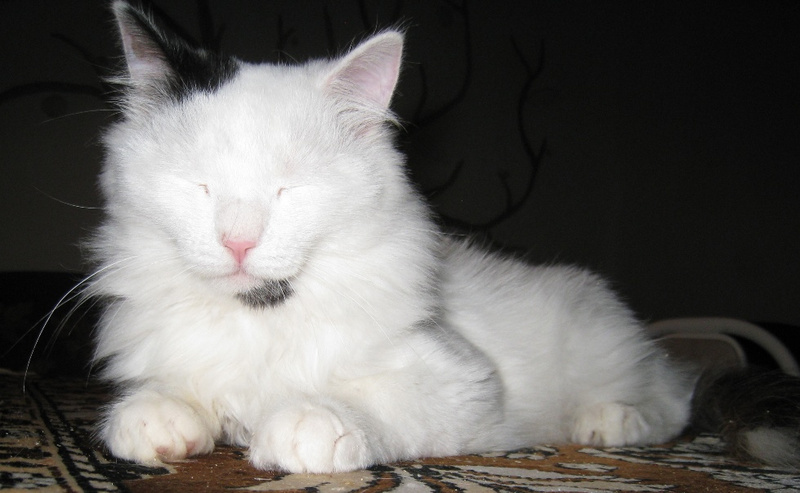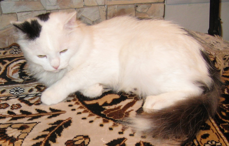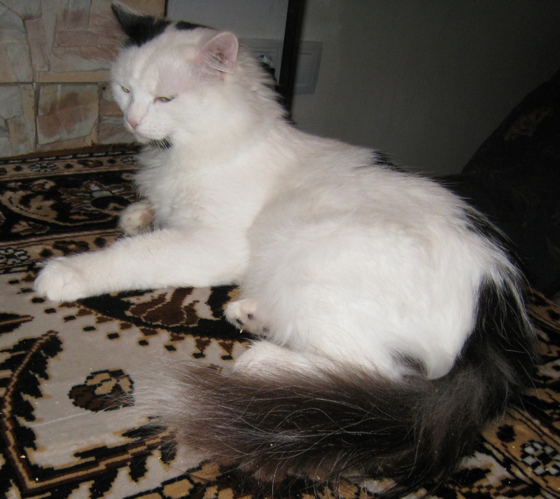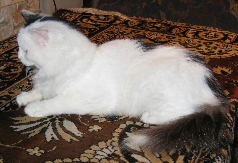 Котейка приятной расцветки - белый с небольшими темными пятнышками и хвостом. Чистенький. Но самое привлекательное - он очень здоровский на ощупь: шелковый и прохладный. Шерсть полудлинная, но не колтунится, поскольку шелковистая.