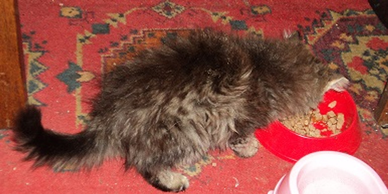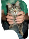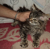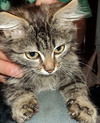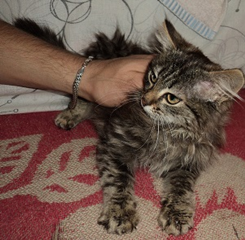 Варежка была найдена в области, грязный голодный котенок прибился к моей машине, не бросать же его на голодную смерть, пришлось забрать, но себе , к сожалению , оставить не могу, места 3х3 и двое кошек, пока маленькое пушистое создание живет в клетке для кроликов, там есть все необходимое, когда прихожу с работы мы с ней бегаем и играем, она этого с нетерпением ждем! остановить её невозможно, на месте не сидит, если она не пылесосит миски моих кошек, то гоняется за мячиком, постоянно мурчит и перебирает лапами, довольно тихая, мяукает когда нужно на лоточек сходить, ходит только по рассписанию, по этому проблем нет, ест все подряд, видно сказывается бездомное прошлое, и без меры, по-этому стараемся ограничивать в еде. На вид месяца 2, очень лохматая, каждый день приходится чесать, вырастит большой сибирской кошкой, в клинике сказали, что полностью здоровый котенок, от блох промазали, от глистов протравили, хотя на вид их и не было, чистенькая, но любит всей мордой и грудью залезать в миску :)! Мышек игрушечных ей лучше не давать, воспринимает как добычу, шипит и пытается проглотить :)! Будет хорошей мышеловкой! очень активная и подвижная, удержать невозможно!