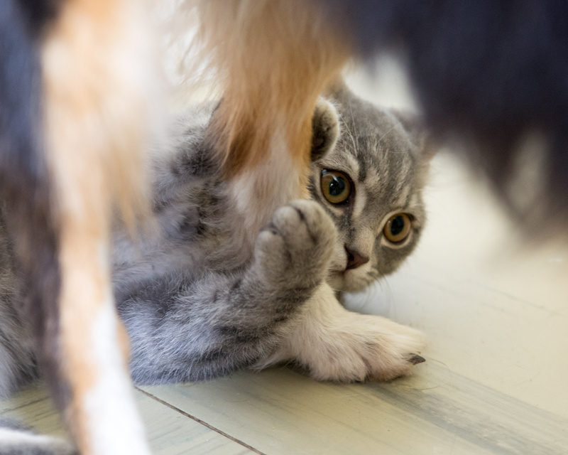 Весит сейчас 1.700, не худенький. Весёлый, добрый, игривый, мурчащий. Собак не боится. Ест сухой корм, писает, какает в горшочек. Одно пока непонятно - где точит когти. Так что Кеша еще и немного загадочный.