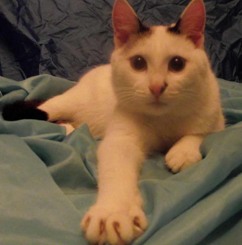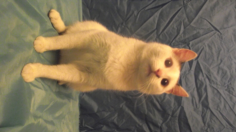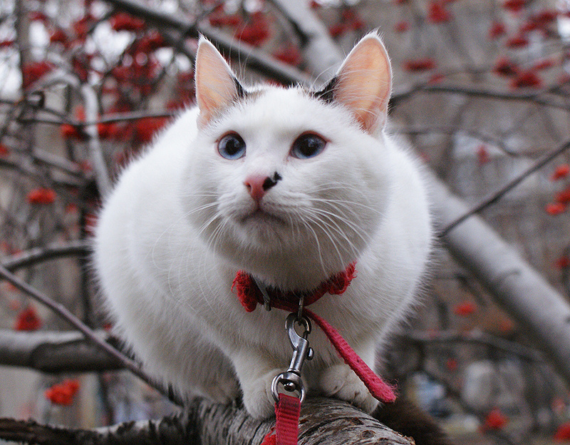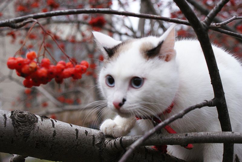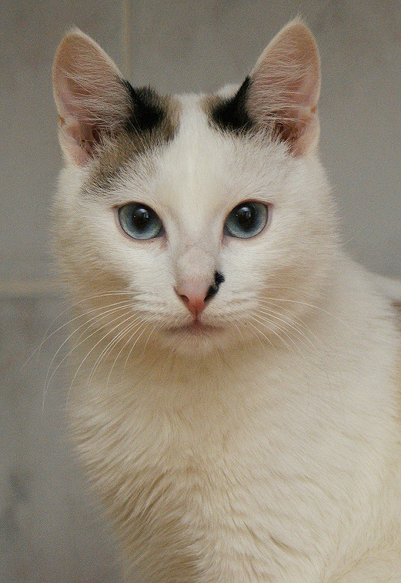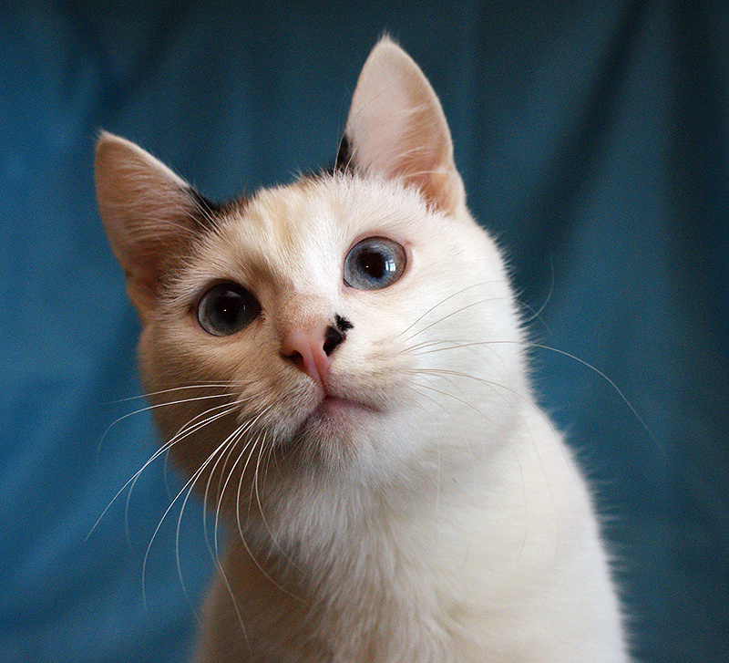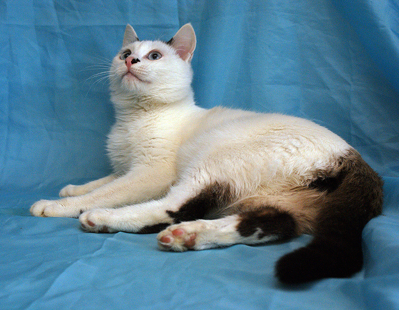 Красота у нас суровая, северная. Голубые глаза, белый мех немного под тайца. Главная наша красота – характер. Спокойный, рассудительный. Любит кататься на любых средствах передвижения (смотрит в окно), любит детей. Когда ему становится что-то интересно – глаза начинают жутко косить. На носу прикольное черное пятно. К сожалению, котенок в последнее время откровенно голодал и еще не отъелся.