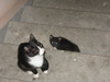 Кошка мама и три котенка. Подбросили в подъезд с недели-две назад.