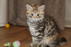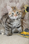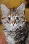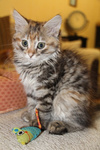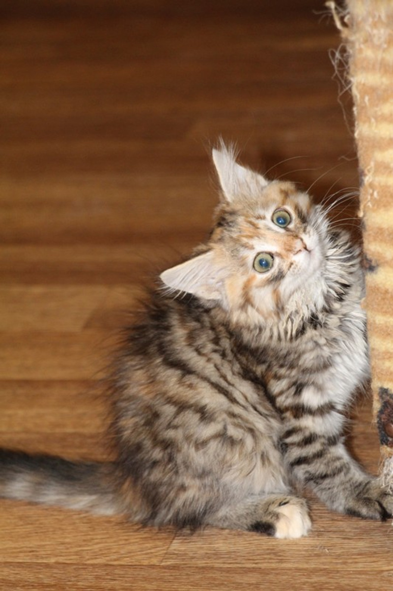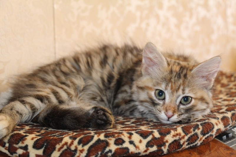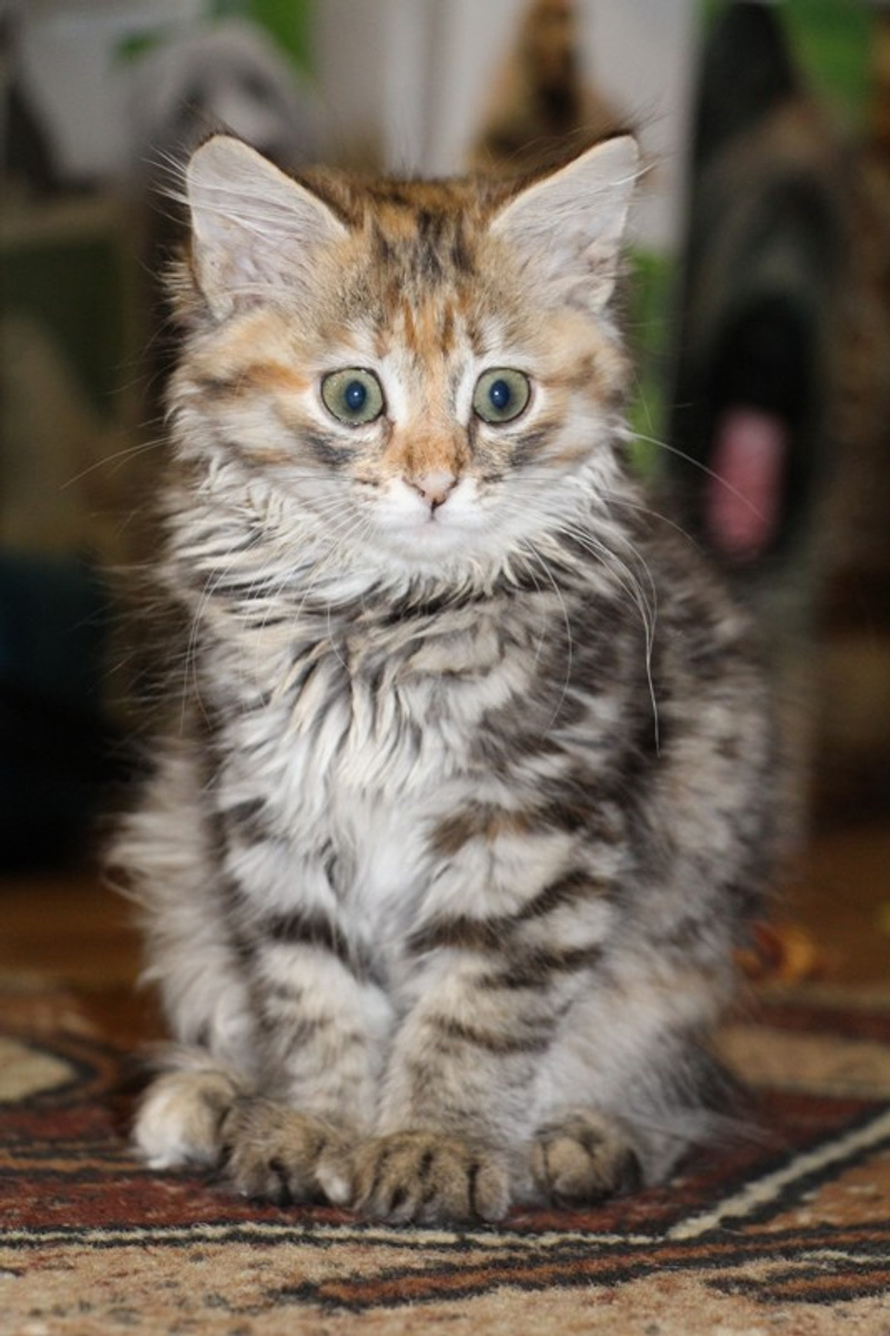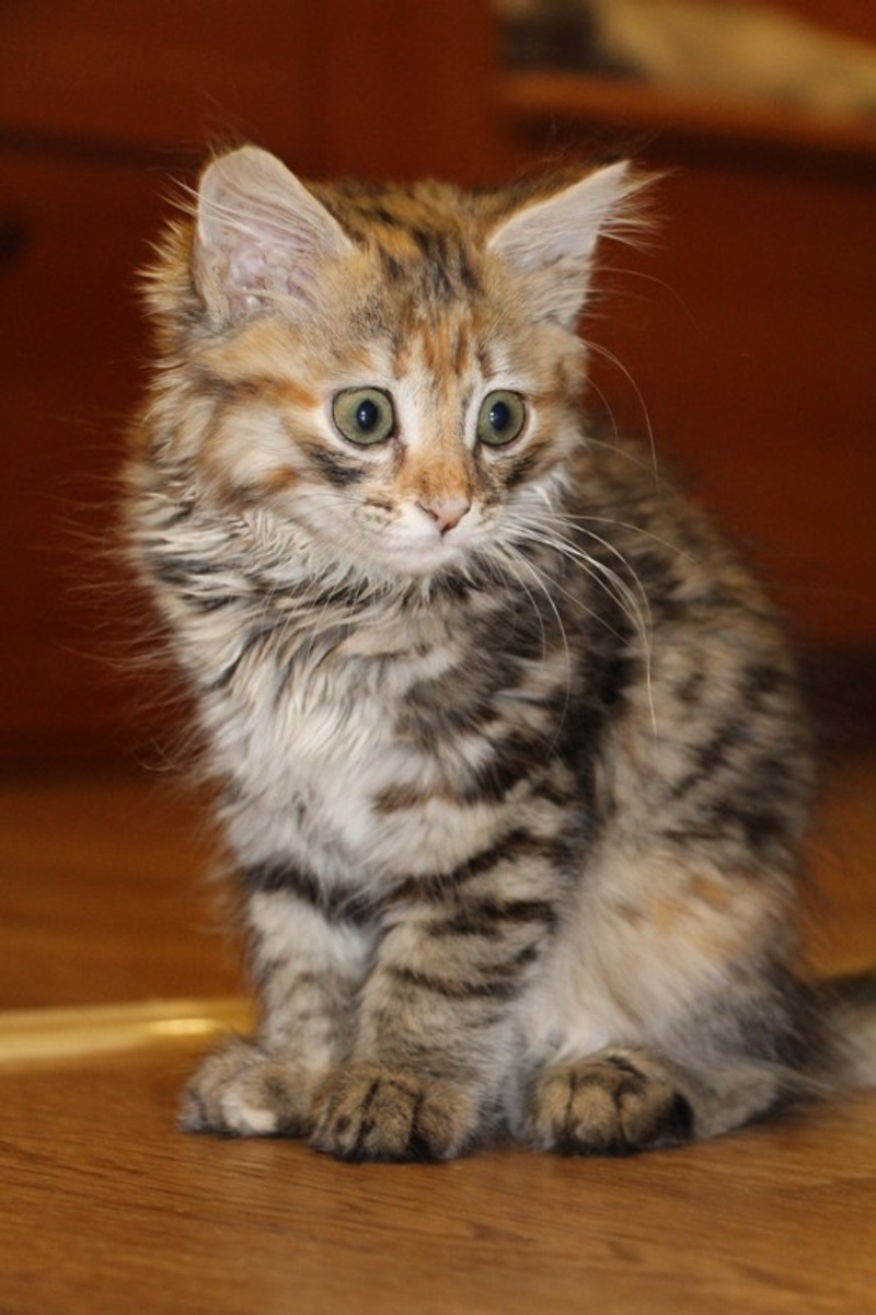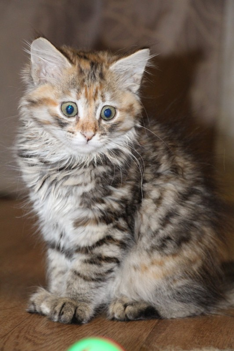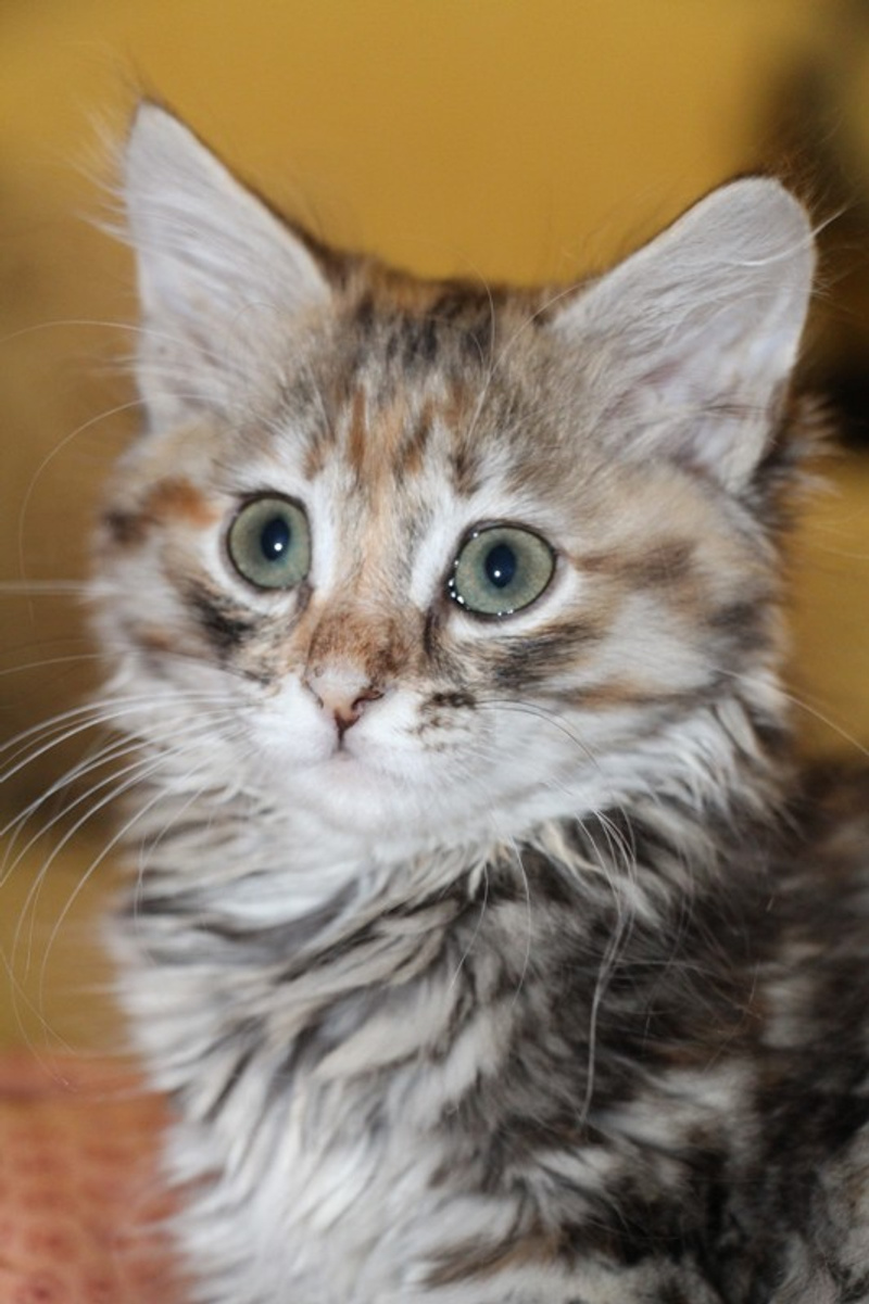 Малышке примерно 2 месяца, к лоточку приучена, кушает влажный корм, сейчас приучаем к сухому, но т.к. Маню прежние горе хозяева кормили чем попало, дается нам это с трудом пока.