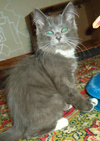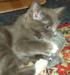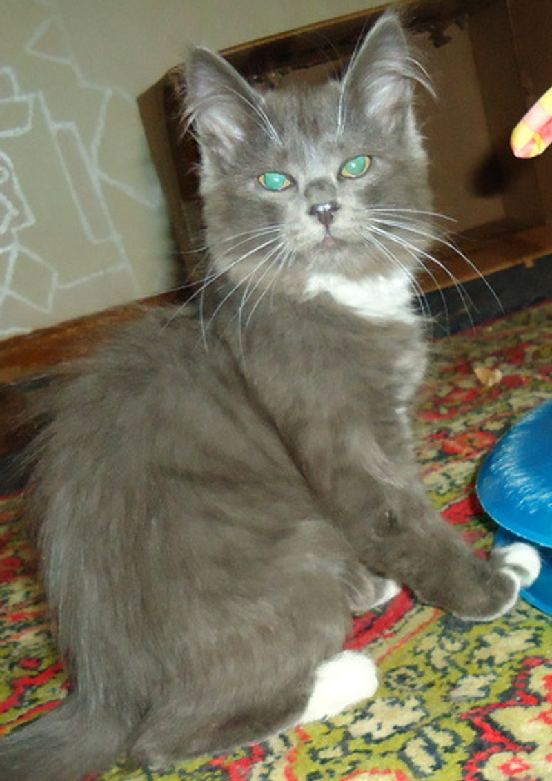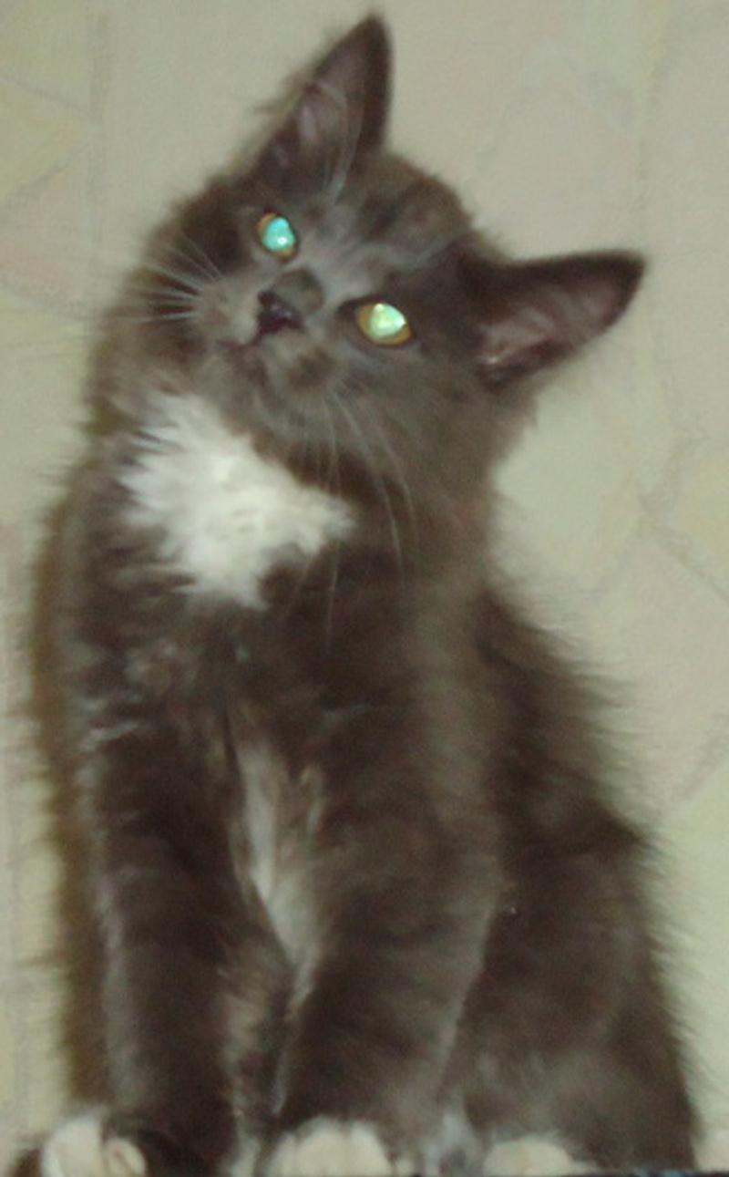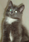 Малыш-подкидыш. Примерно месяца 3 от роду. Окрас как у русского голубого + белые носочки и грудка. Полупушистый с "мохнатыми" ушками.