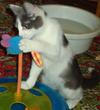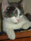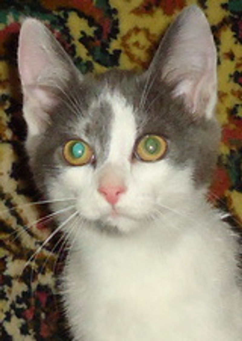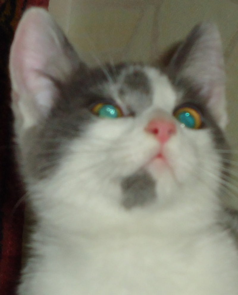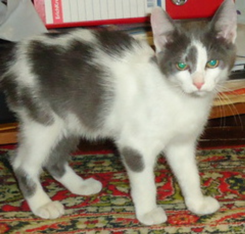 Гладкошерстный. Основной фон белый, и на нем много голубых пятен (~50%). Самое прикольное его уши - большие ухопланы! По характеру очень активный, игручий и любознательный.