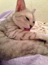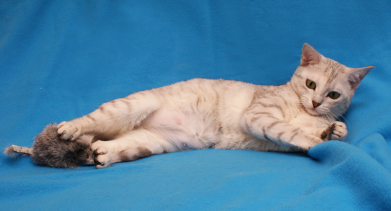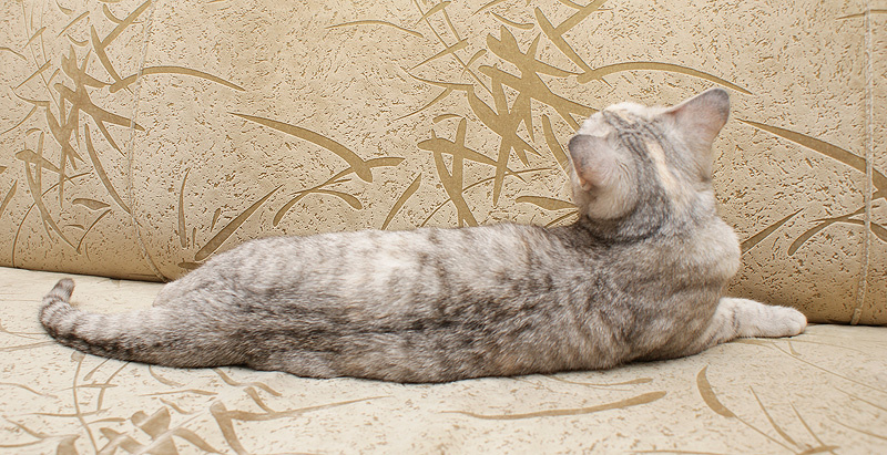 Она знает, что она красивая, всячески это подчеркивает, то хвостиком вильнет заигрывающе, то глазками ведет в сторону, то ляжет изящно, вытянув лапки.)