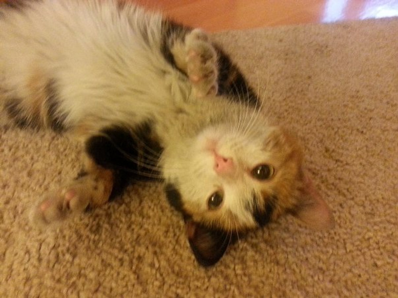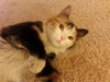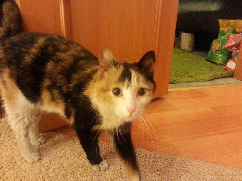 Трехцветка, похоже, около 6 месяцев от роду (зубы молочные)