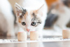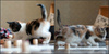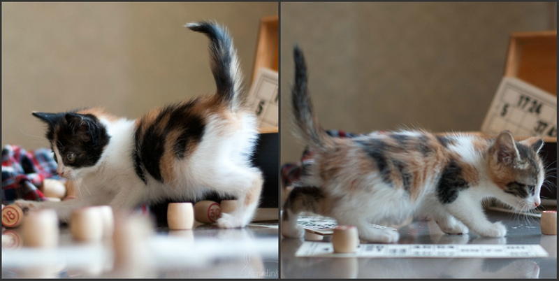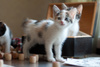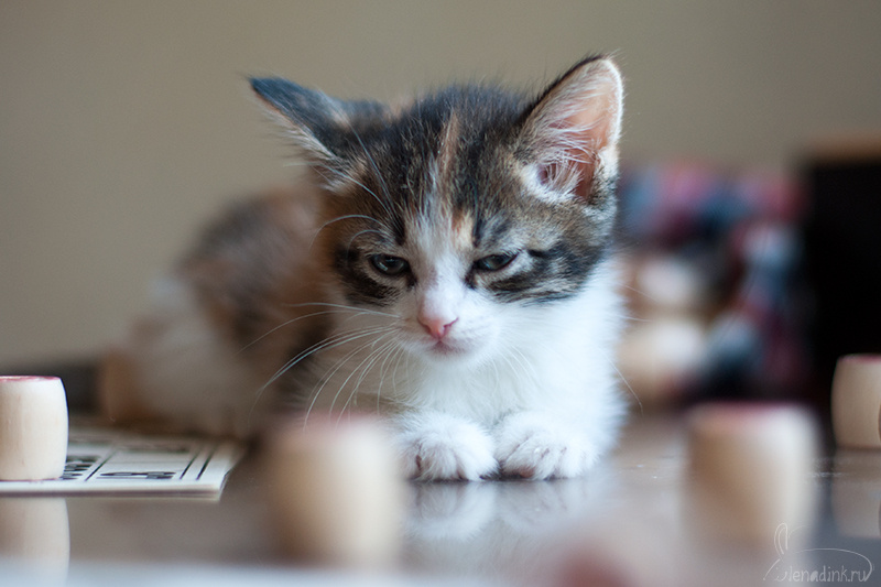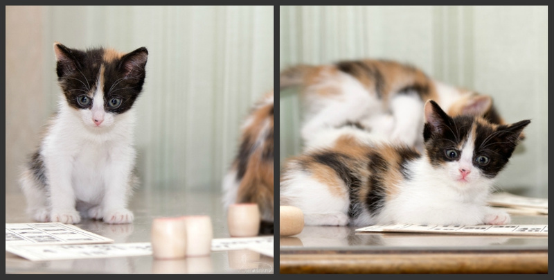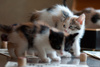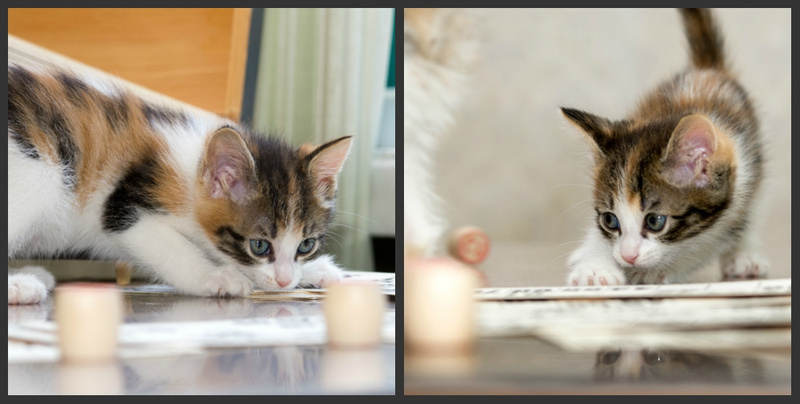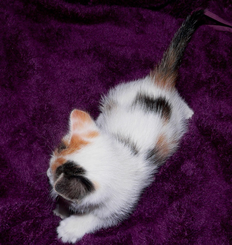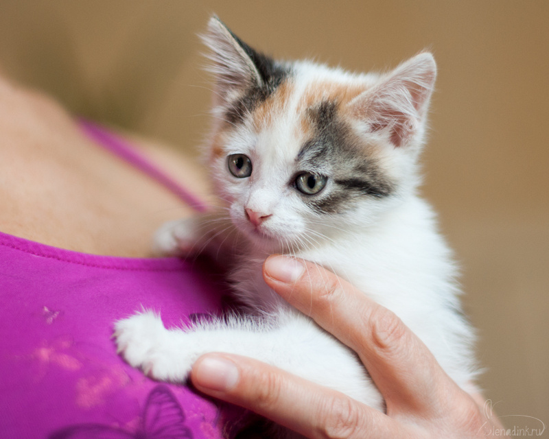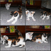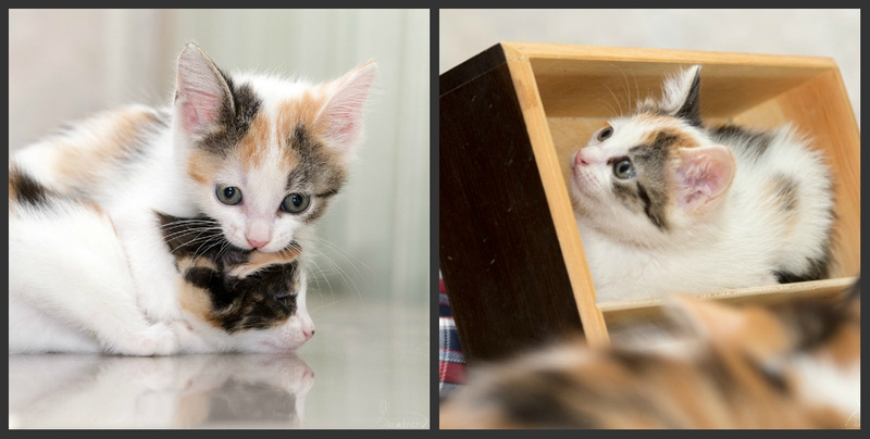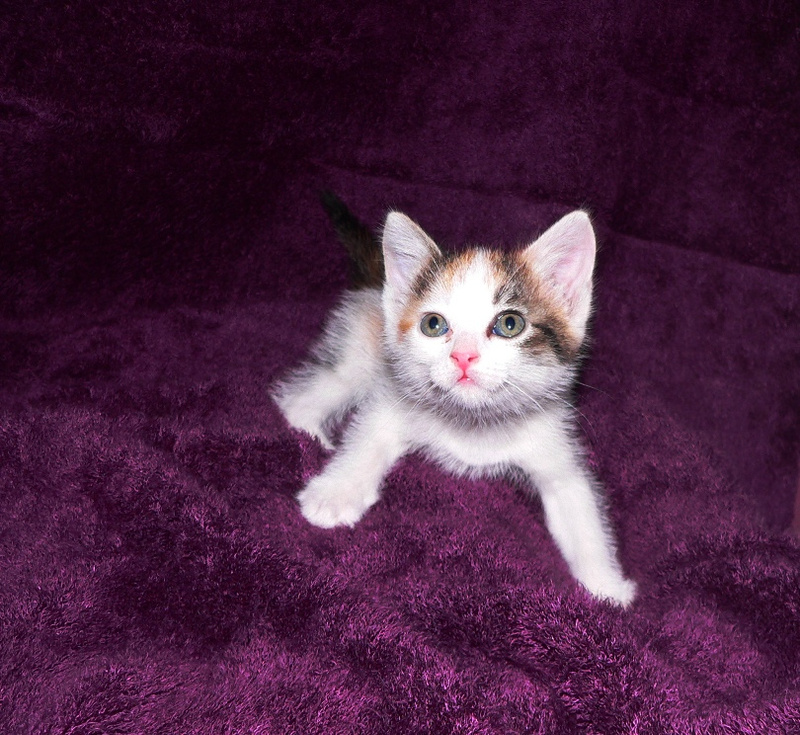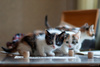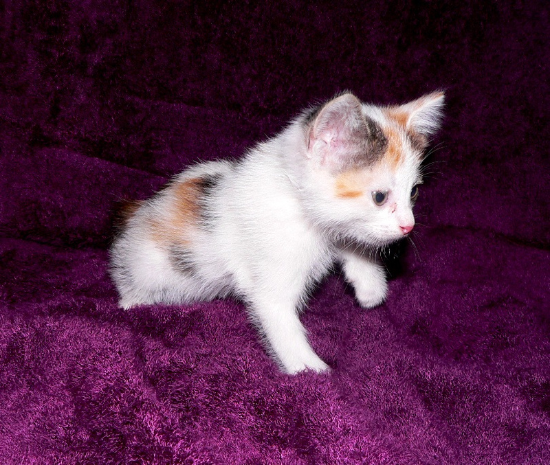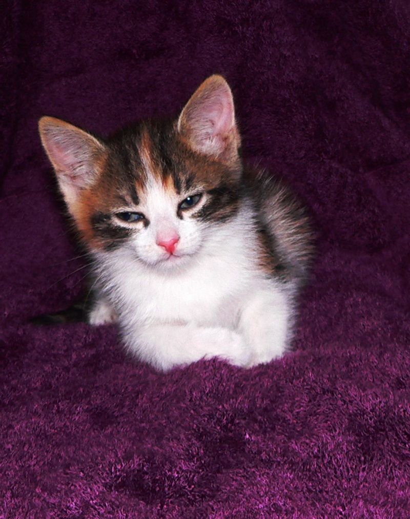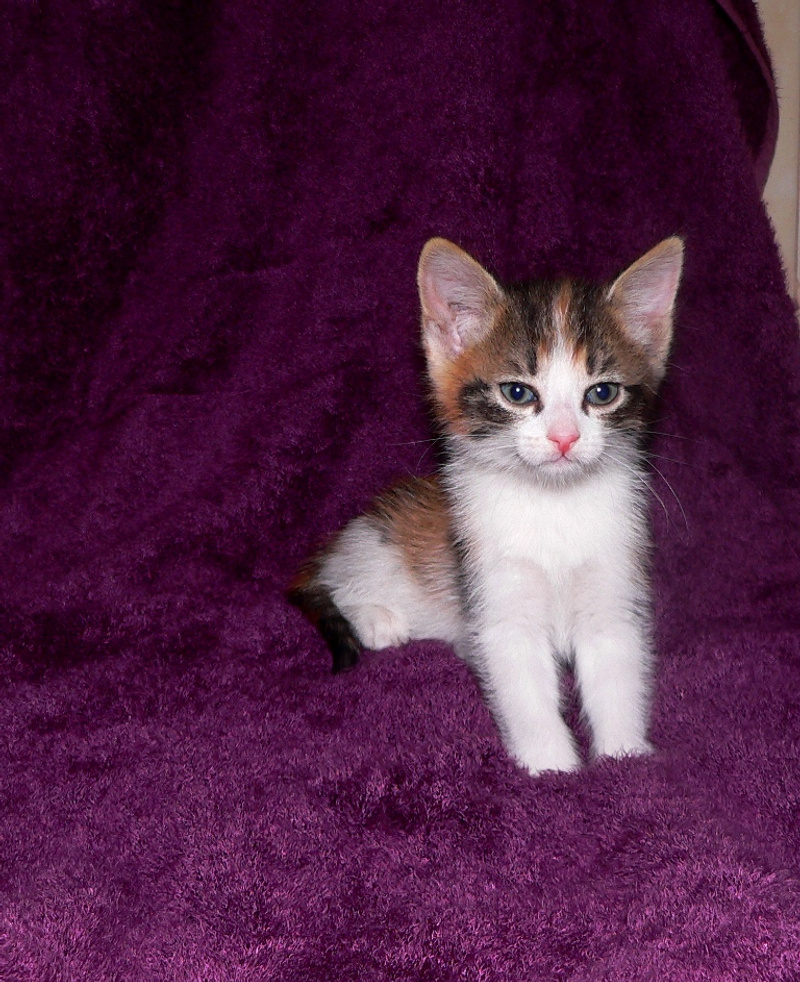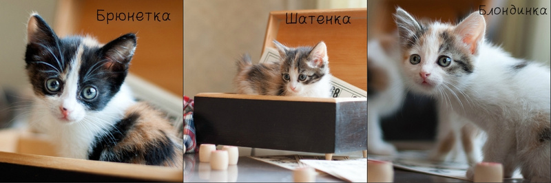 Внешне представляют собой компашку из трех очень симпатичных, мелких по возрасту (месяц или чуть больше) и массе (около 450 гр) трехцветных кошко-девочек. Едят сами, в еде не привередничают.