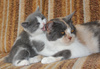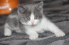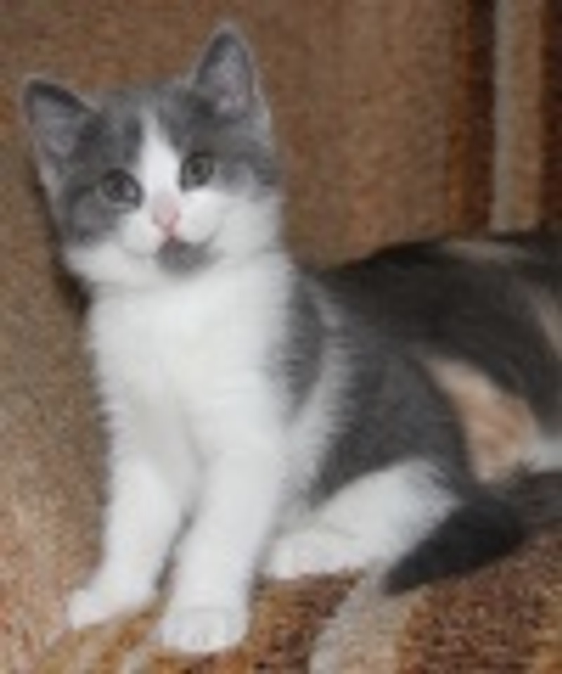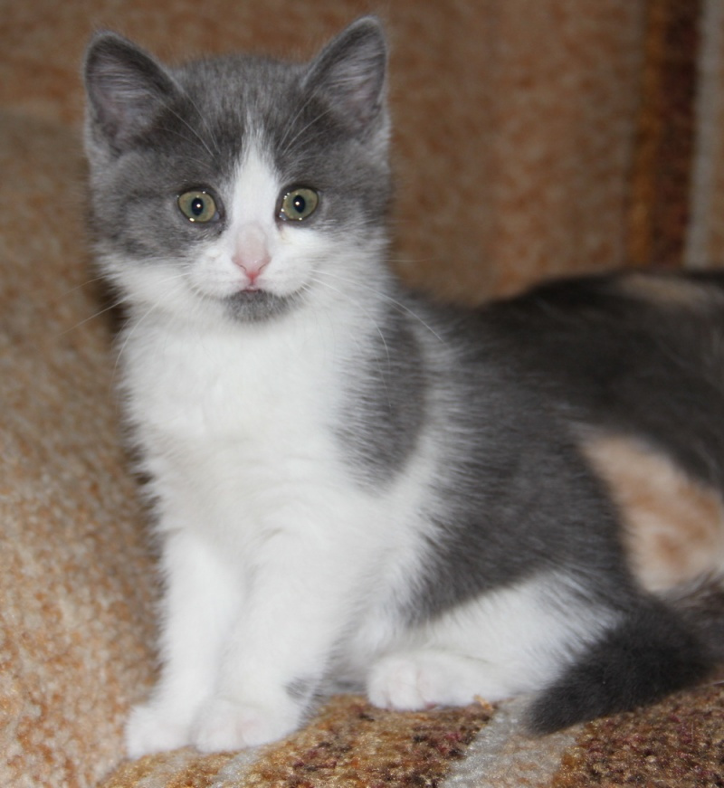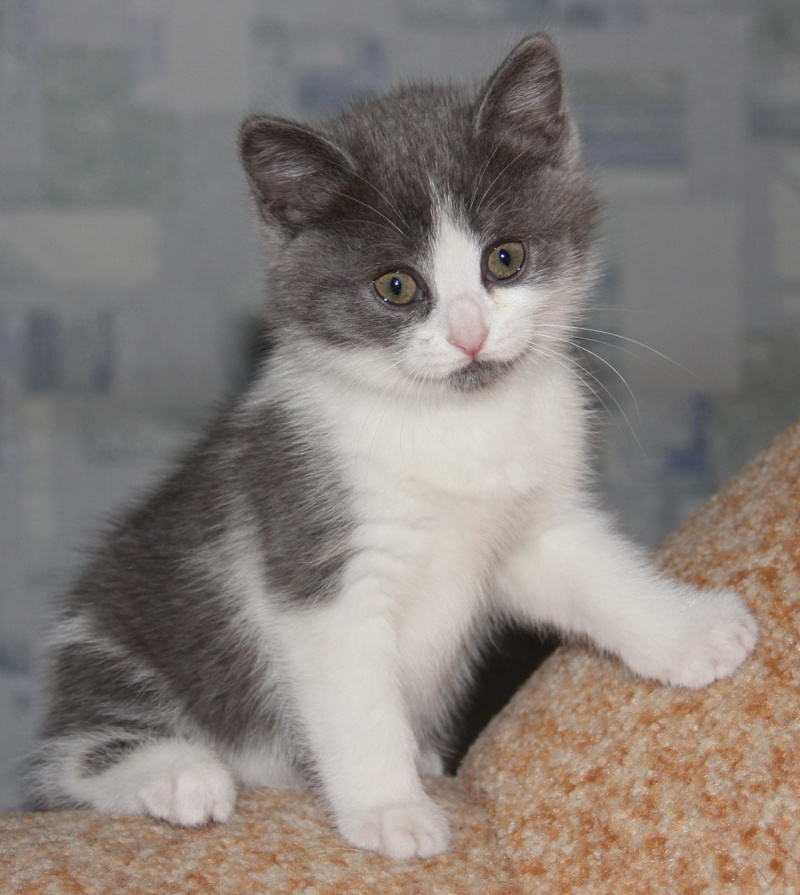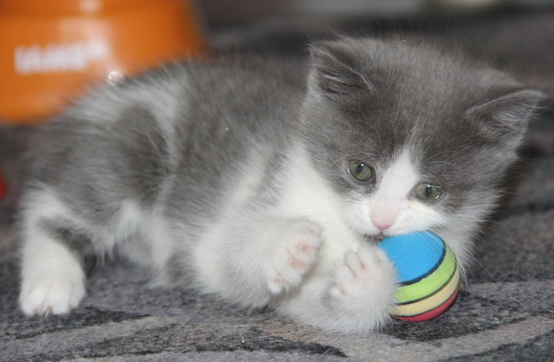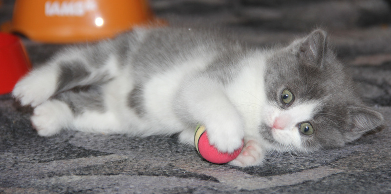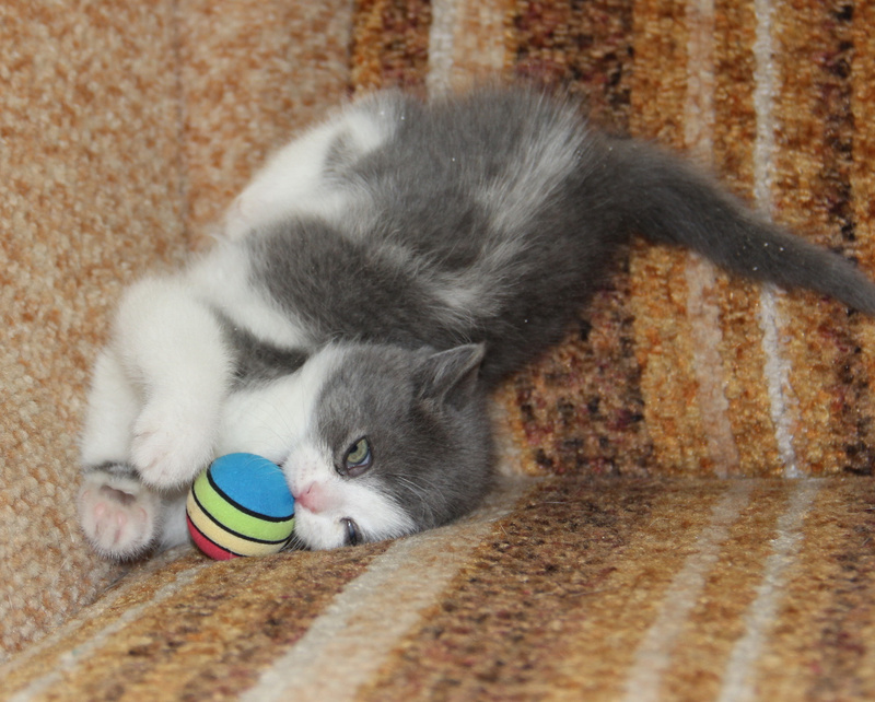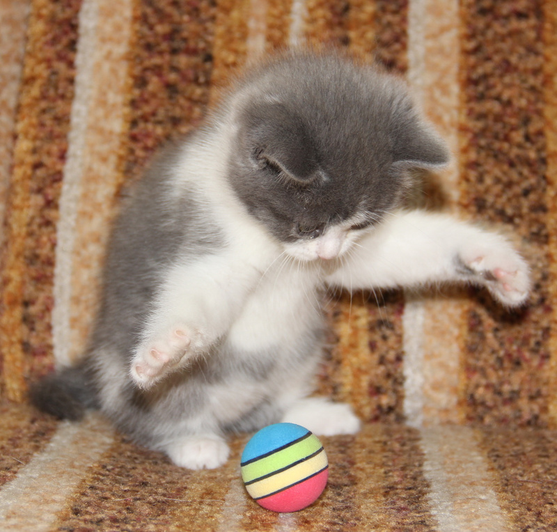Вовсю гоняет мяч, учится хрустеть сухом кормом для котят, осваивает походы в лоточек. Котёнок очень приятный на ощупь, мягенький, толстенький.
